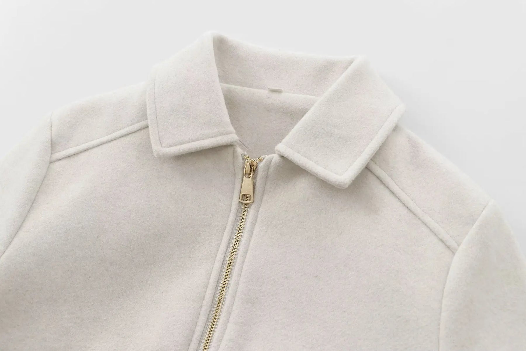Diese kurzjacke vereint cleanen streetstyle mit softem wollmix. der umlegekragen und der goldfarbene zip setzen dezente akzente, während große taschen funktional bleiben. leicht zu kombinieren mit denim, knit und boots – eine vielseitige damen jacke für jeden tag.