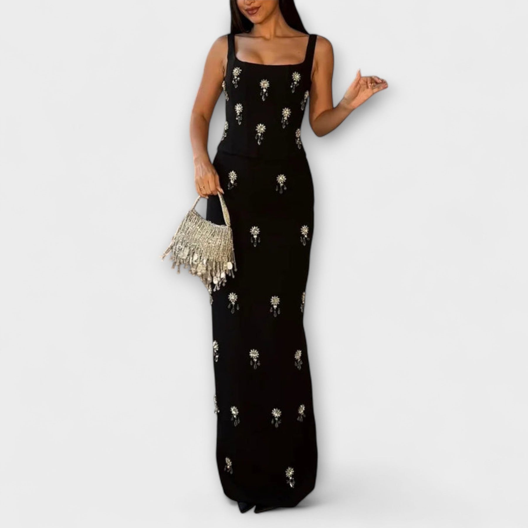 Aviane vereint raffinierte Eleganz mit moderner Raffinesse – ein zweiteiliges Ensemble, das auffällt und dabei zeitlos bleibt. Das perlenverzierte Zipper-Top bringt Struktur und Glanz, während der passende Rock mit schlichter Linienführung und femininer Silhouette überzeugt. Ein Look für Frauen, die sowohl Klasse als auch Stärke ausstrahlen.