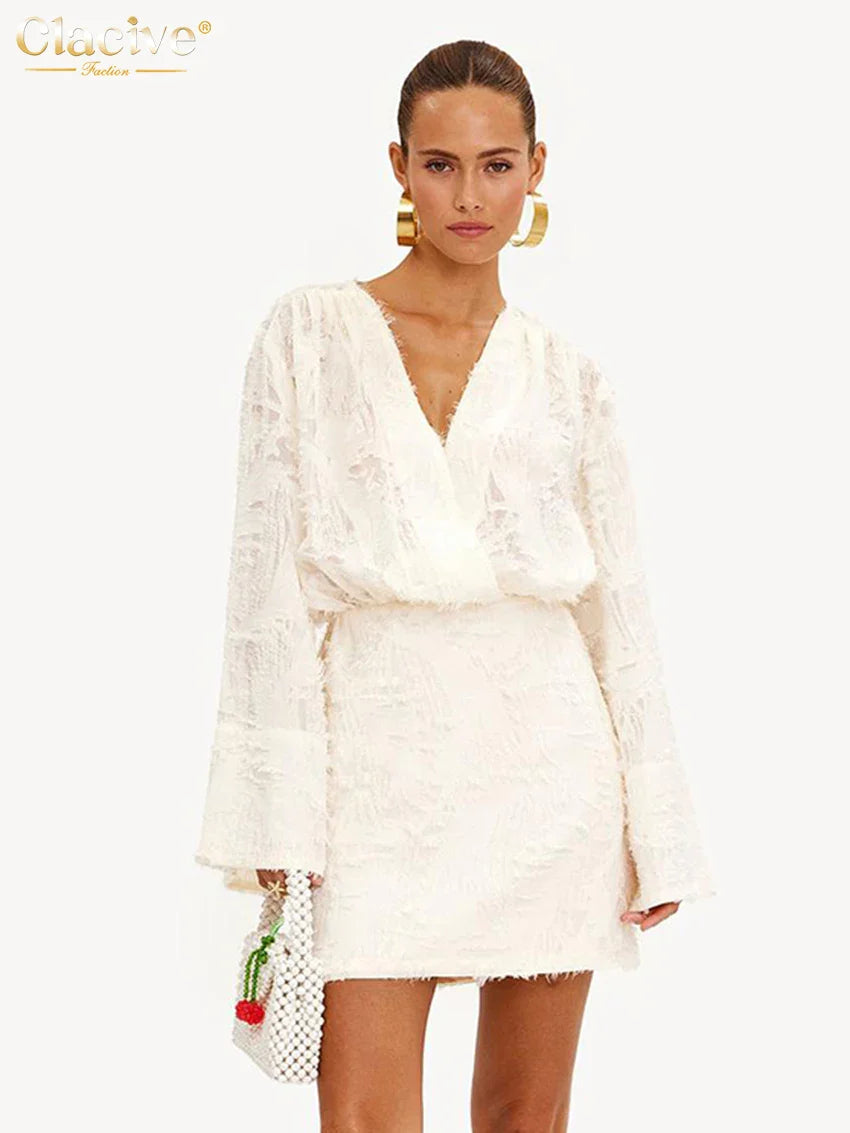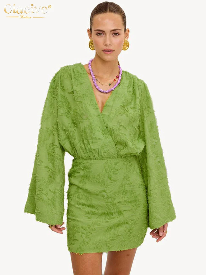 Clacive Herbst Lose Gelb Casual Frauen Kleider 2024 Sexy V-ausschnitt Langarm Mini Kleid Elegante Klassische Hohe Taille Weibliche Kleid