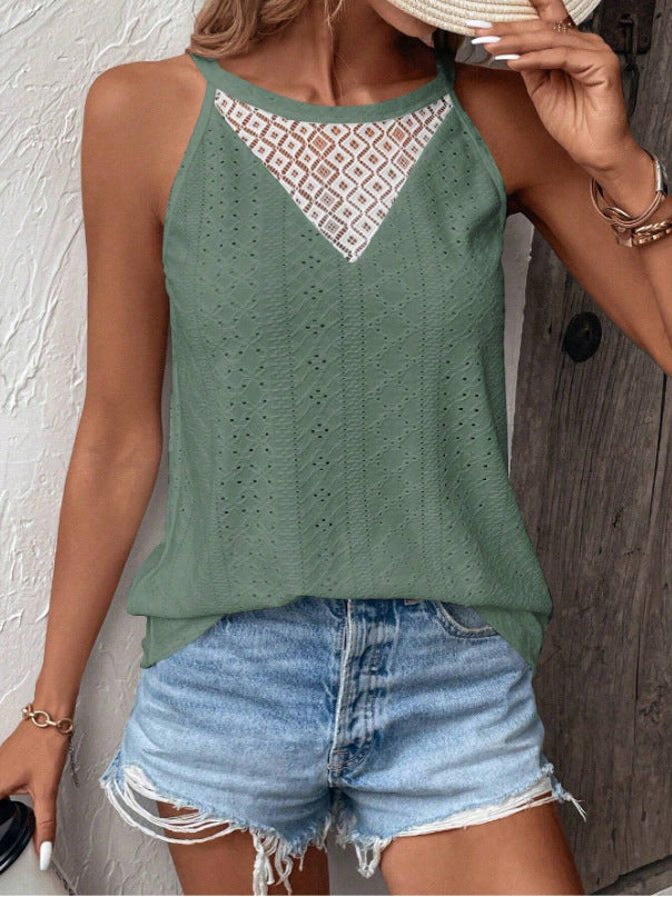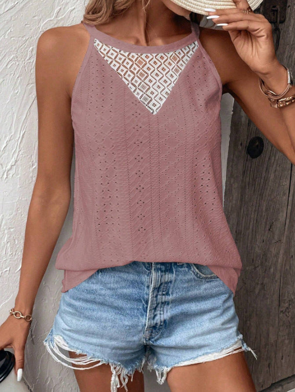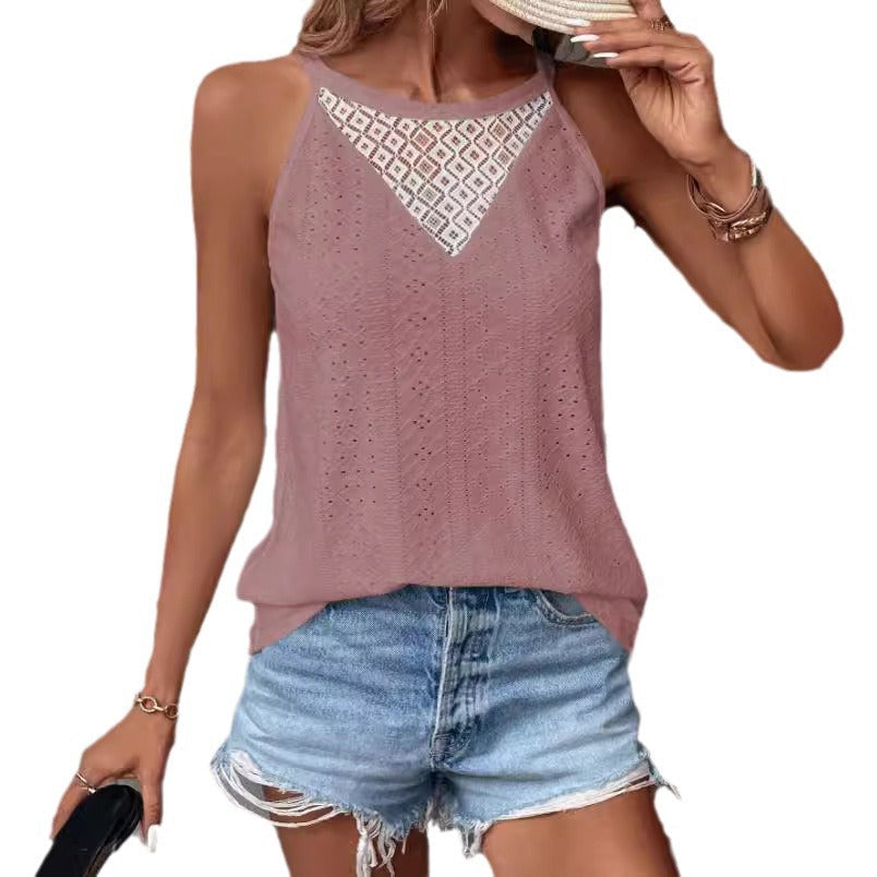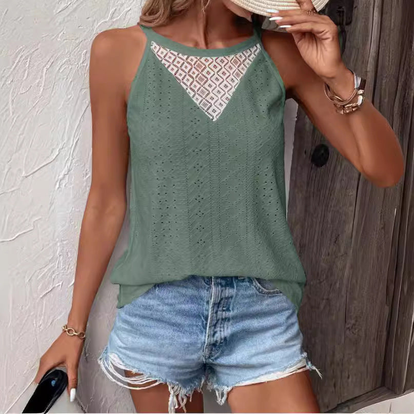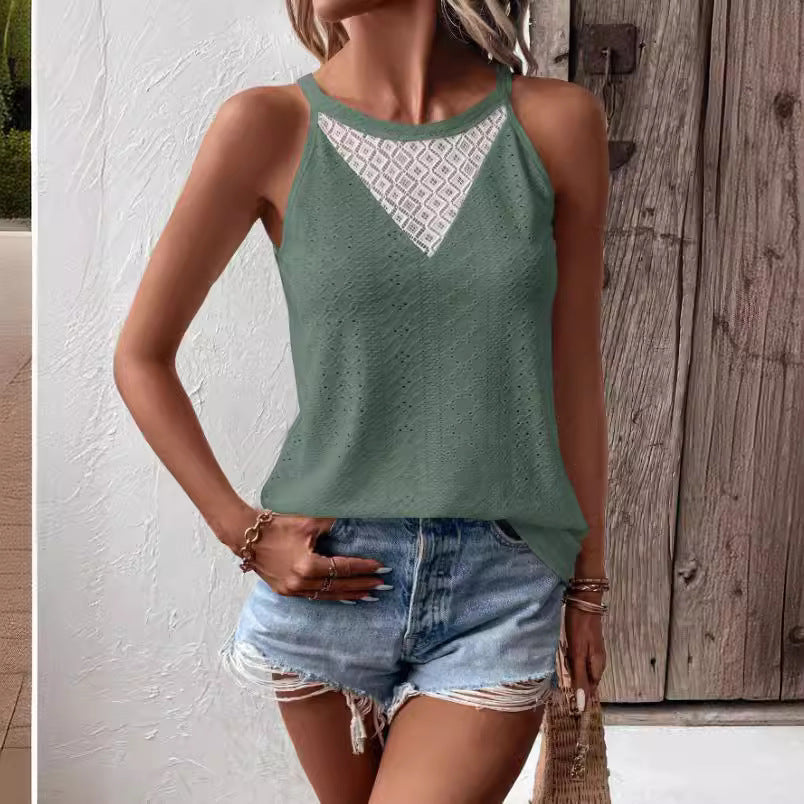 Damen ärmelloses Oberteil mit feiner Lochmusterung und eleganter Spitzeneinsätze Fudus