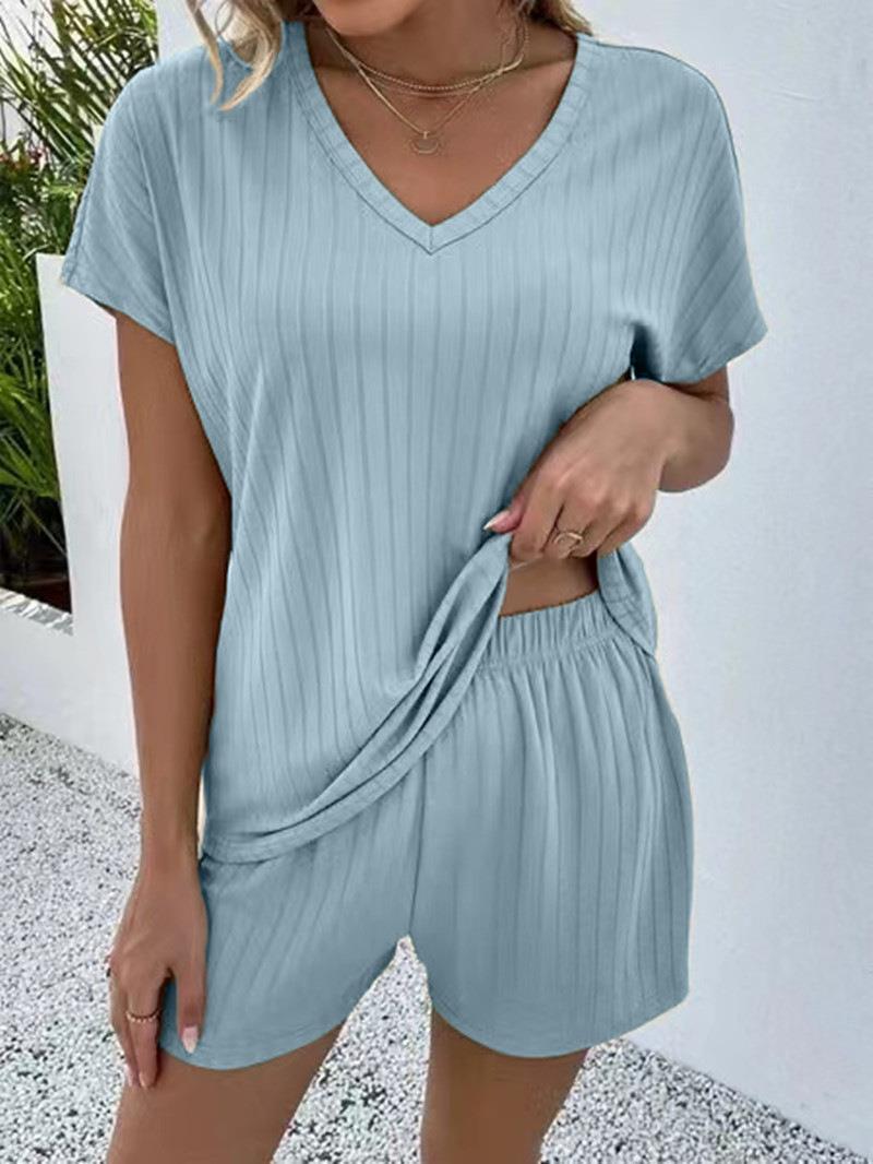 Entdecken Sie unser stilvolles und komfortables Kurzset, perfekt für die warme Jahreszeit. Diese Kombination aus einem lässigen T-Shirt mit V-Ausschnitt und passenden Shorts bietet Ihnen sowohl Komfort als auch Eleganz.