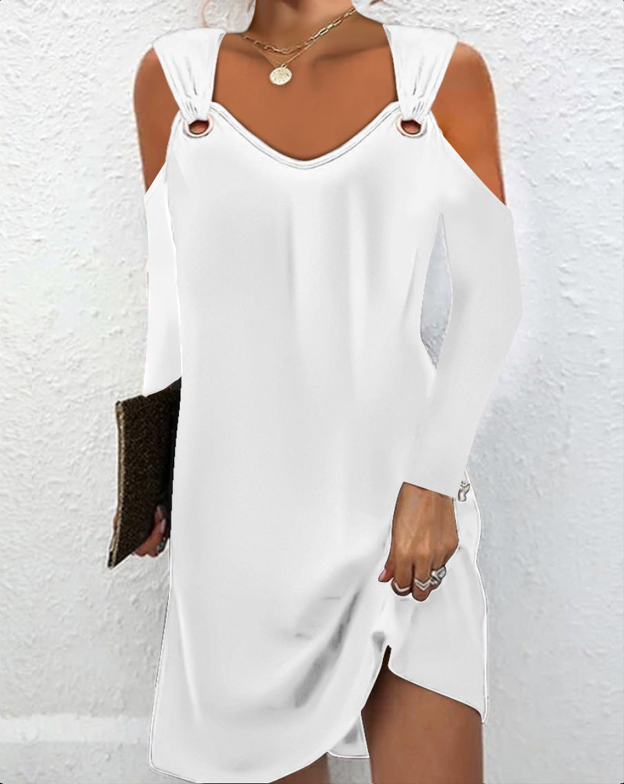 Damen elegantes Kleid mit kaltem Schulterdesign und dekorativen Ringen Fudus