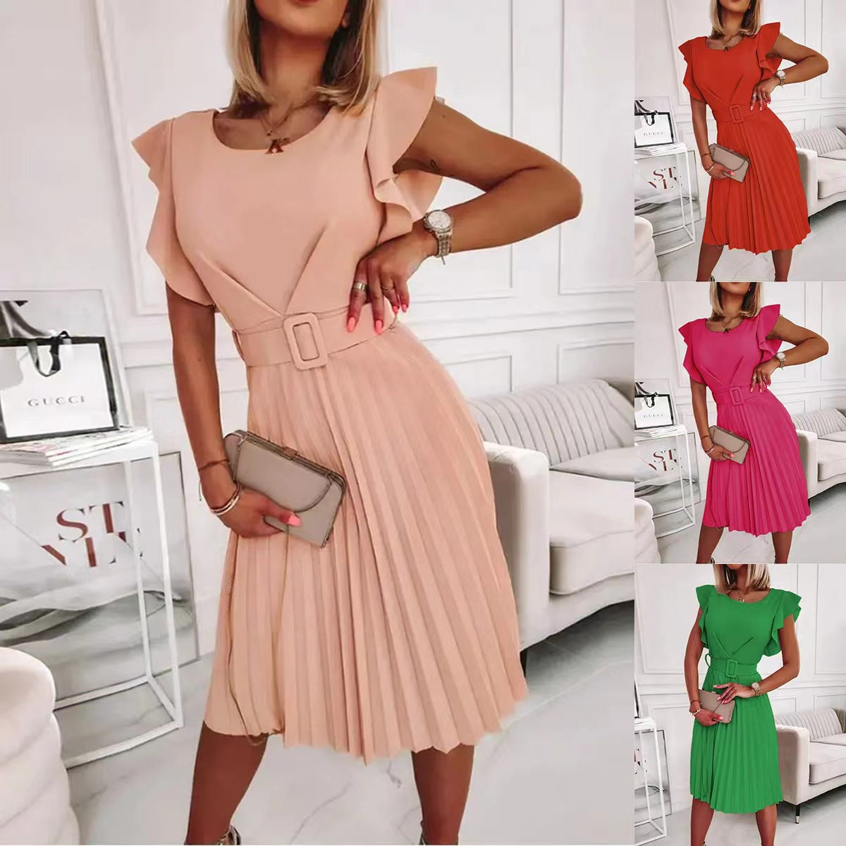 Damen Faltenrock-Kleid mit Rüschendetails und Taillengürtel Fudus