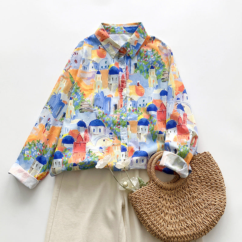 Entdecken Sie die kreative und farbenfrohe Kunstbluse von Fudus, die perfekt für kreative Outfits ist. Diese Bluse begeistert mit einem einzigartigen Druck, der Inspiration aus mediterranen Landschaften schöpft. Sie kombinieren mühelos Stil und Komfort.