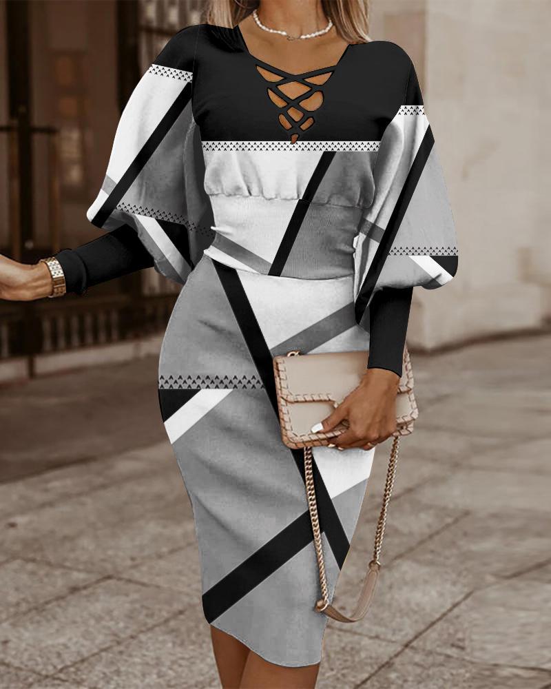 Damen kariertes Midi-Kleid mit ballonärmel und tiefem V-Ausschnitt Fudus