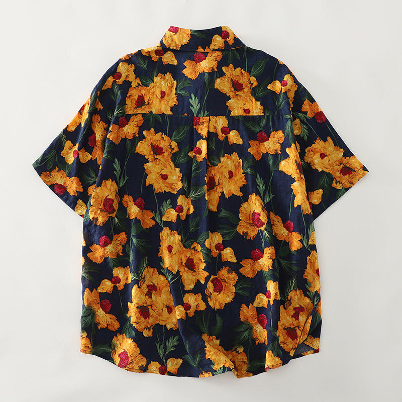 Damen Kurzarmhemd mit buntem Blumenmuster und elastischem Stoff Fudus