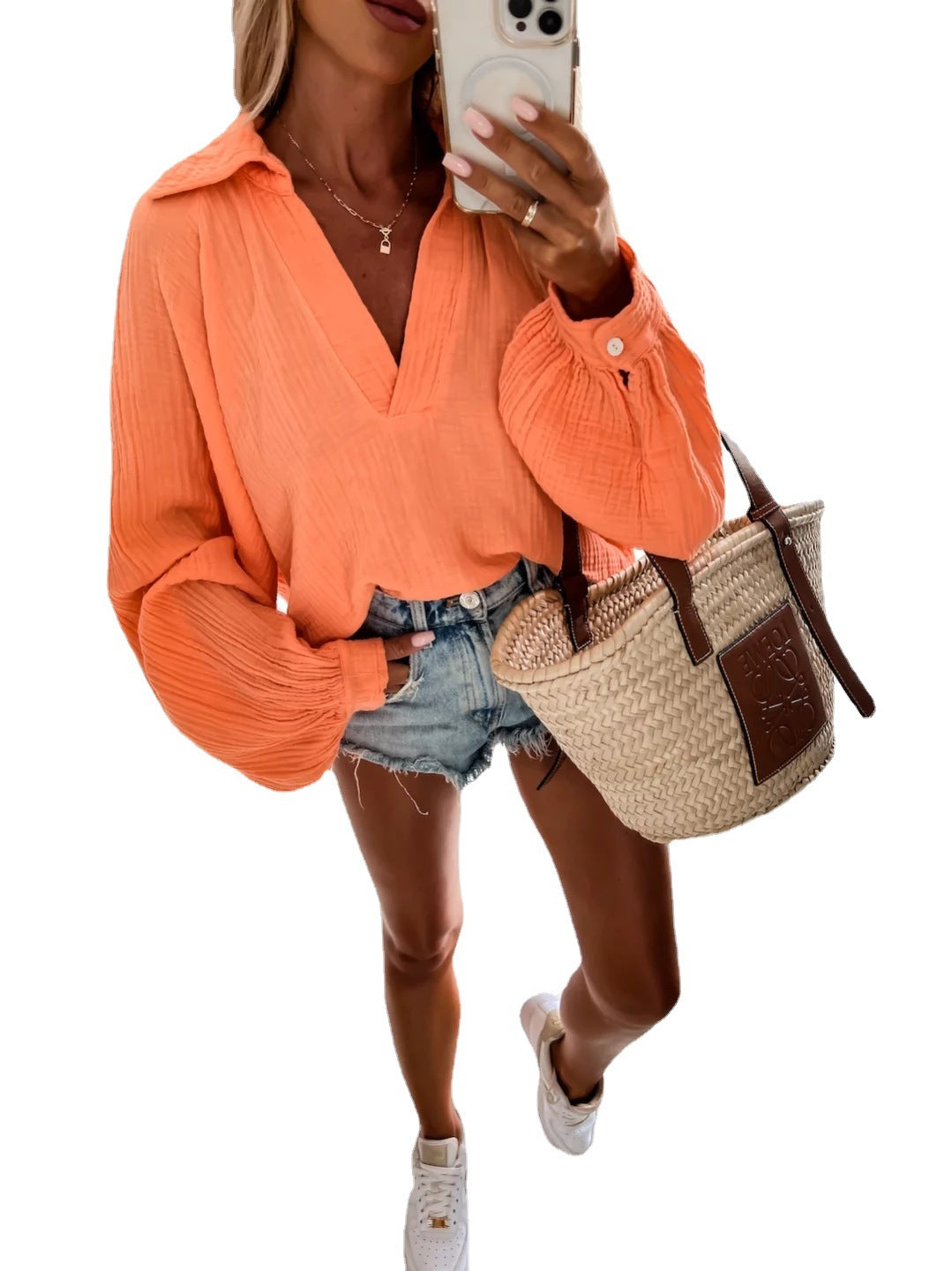 Damen lässige Bluse mit tiefem V-Ausschnitt und voluminösen Ärmeln Fudus