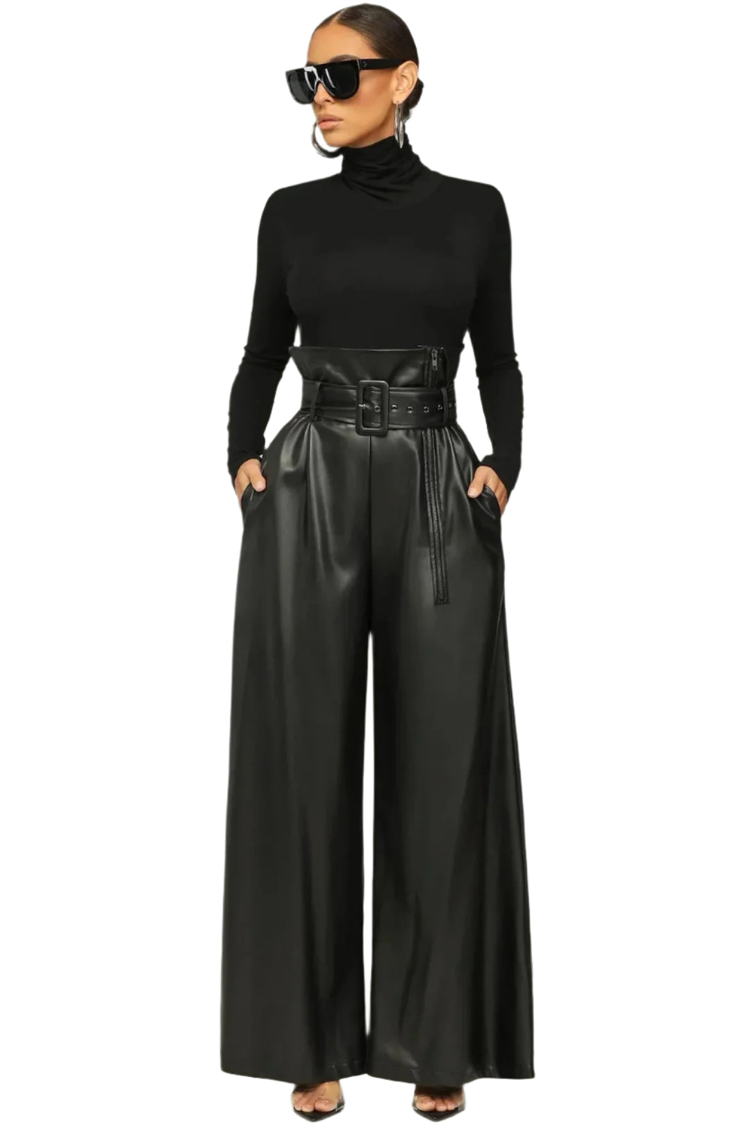 Damen Lederhose mit weitem Bein und Metallgürtel – Trendiger Herbstlook