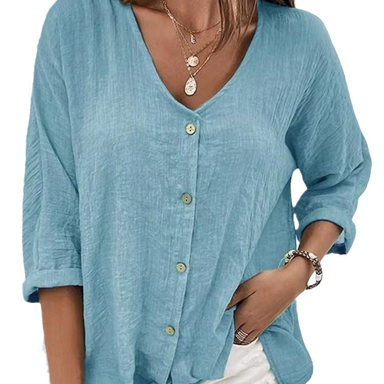 - Ärmel: Modische 3/4-Ärmel, die sich leicht aufrollen lassen, um ein lockeres Gefühl zu erzeugen.