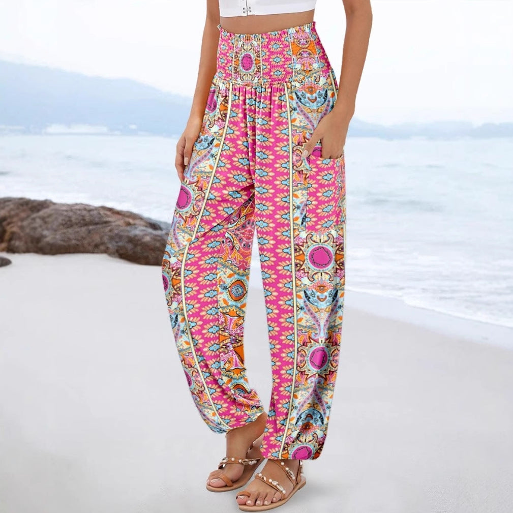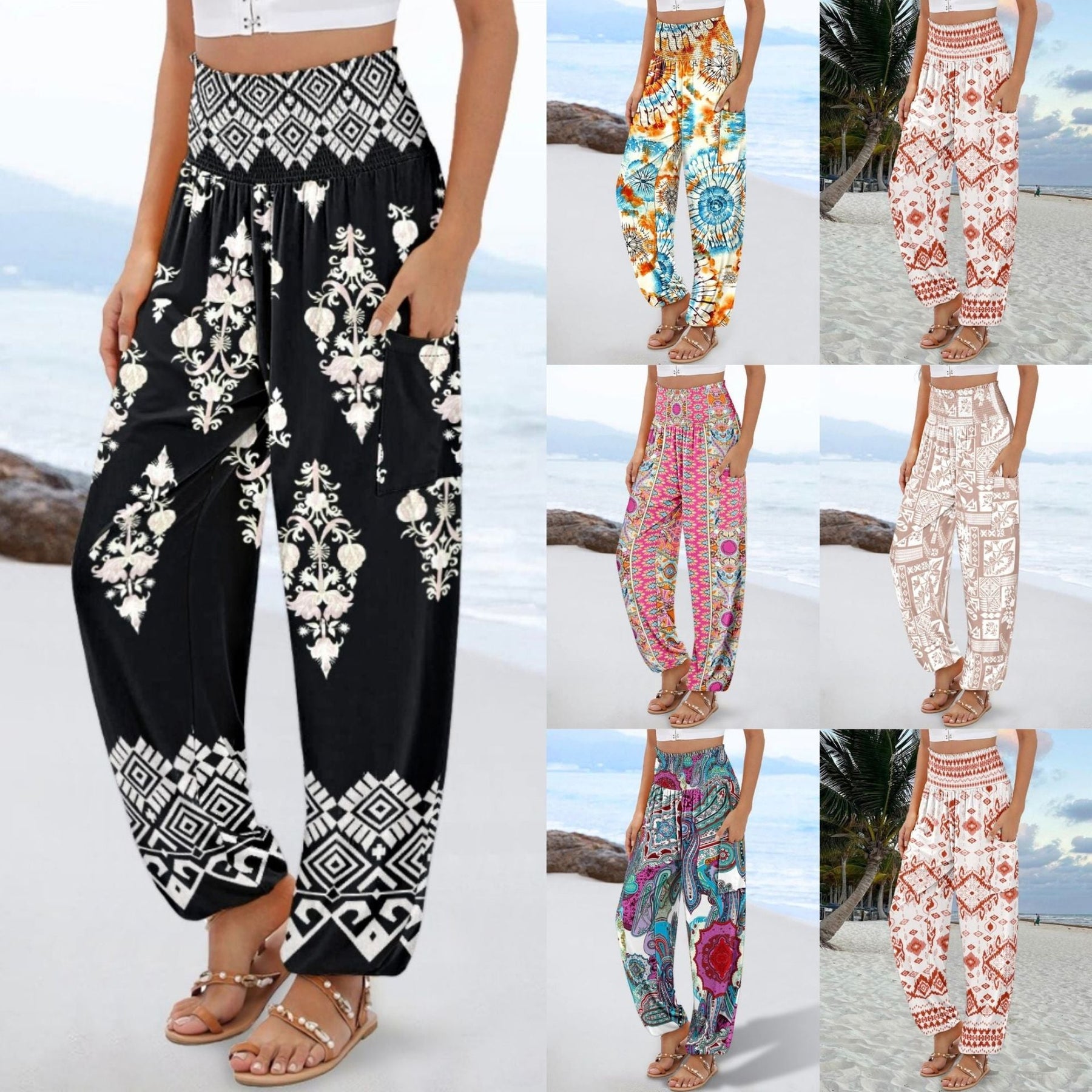 Damen luftige Palazzo-Hose mit grafischem Moulage-Muster und hochelastischem Bund Fudus