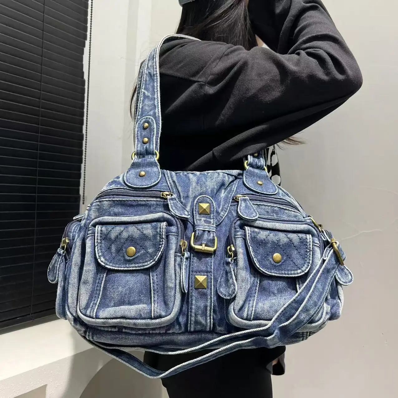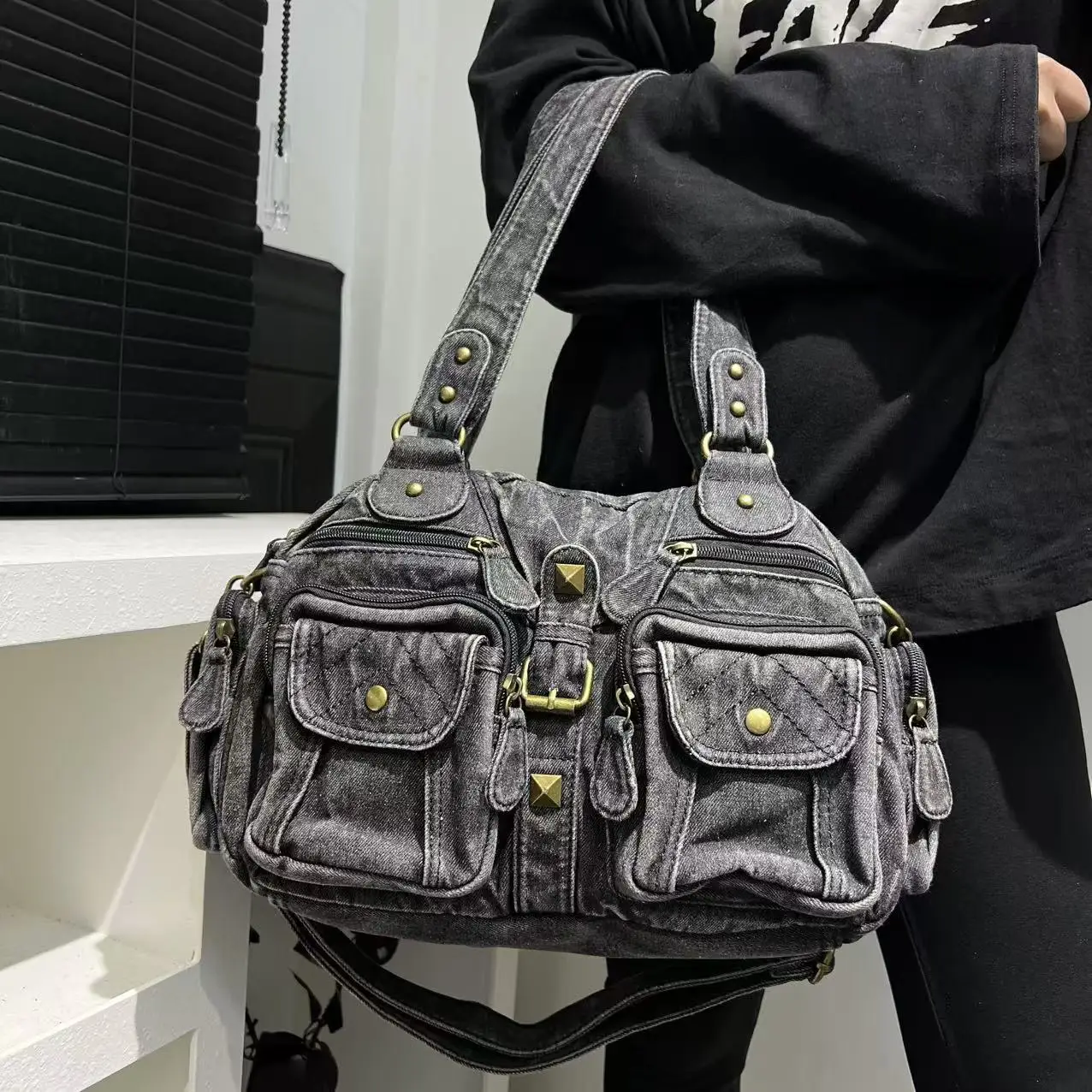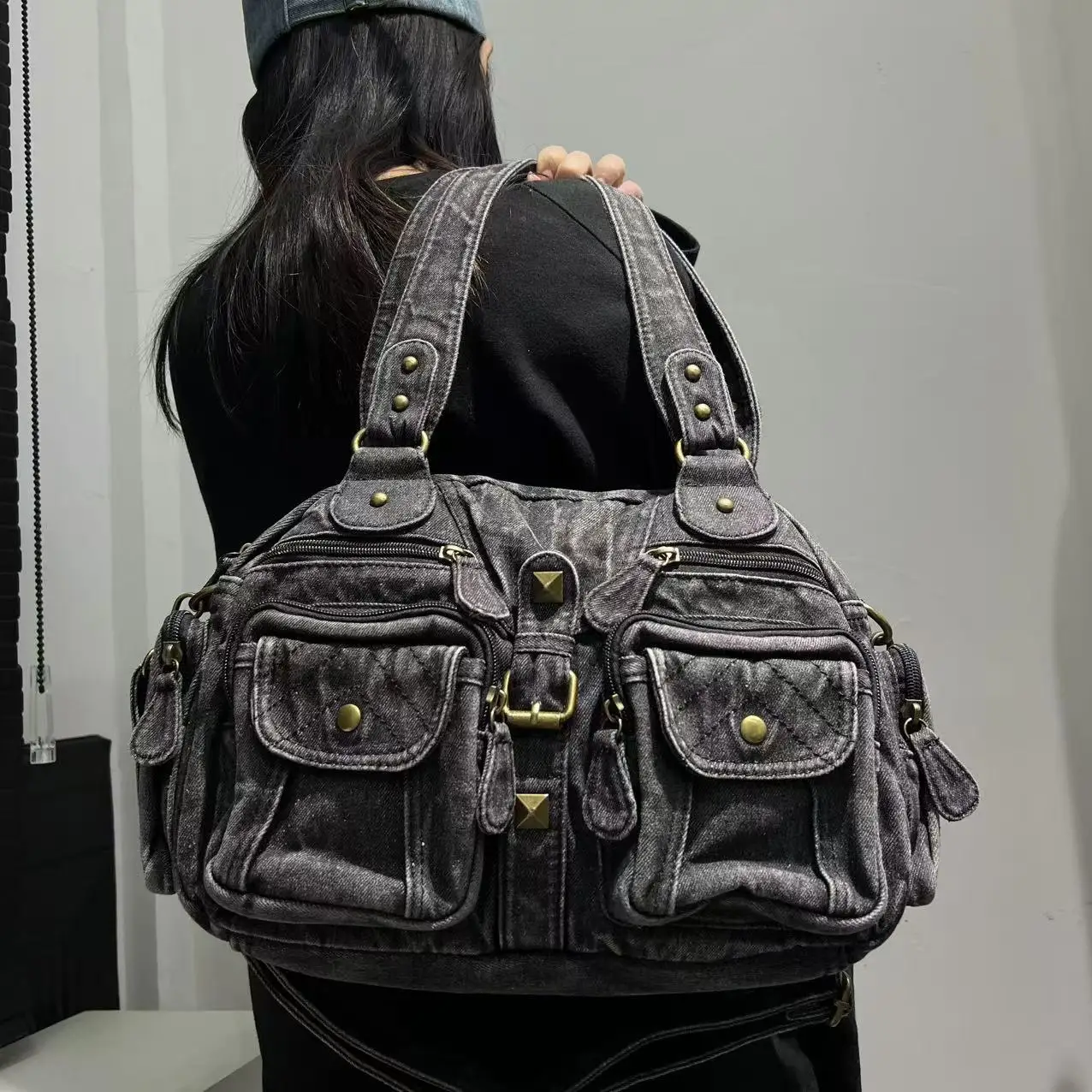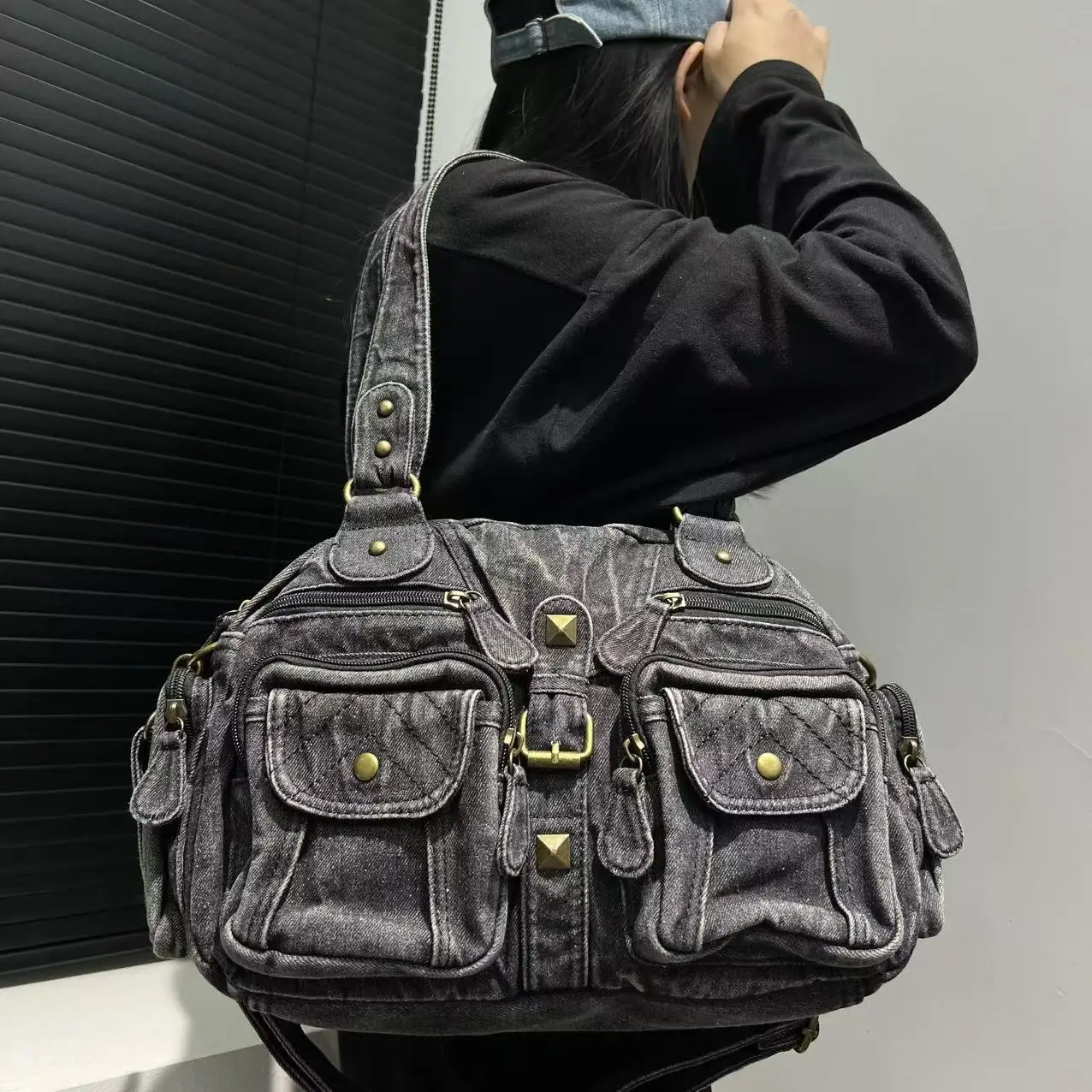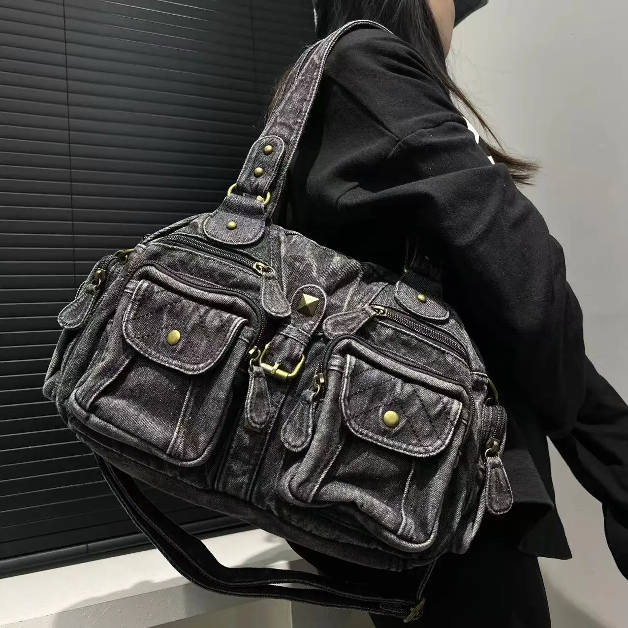 Damen Y2K Retro Mehrfach-Taschen Handtasche - Große Kapazität, Distressed Schultertasche