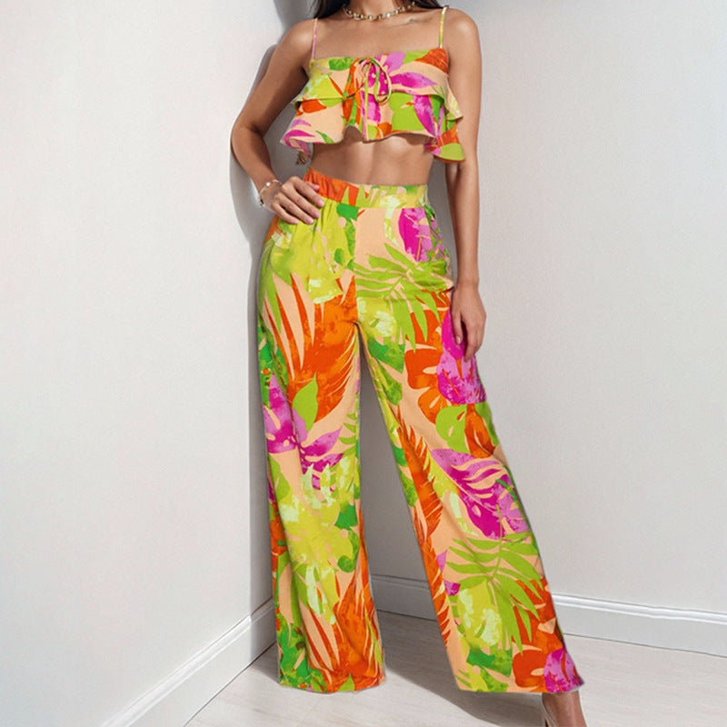 • Gemusterte Hosen: Die weit geschnittenen Hosen sind mit einem lebhaften Pflanzenmuster versehen, das ideal für den Sommer ist.