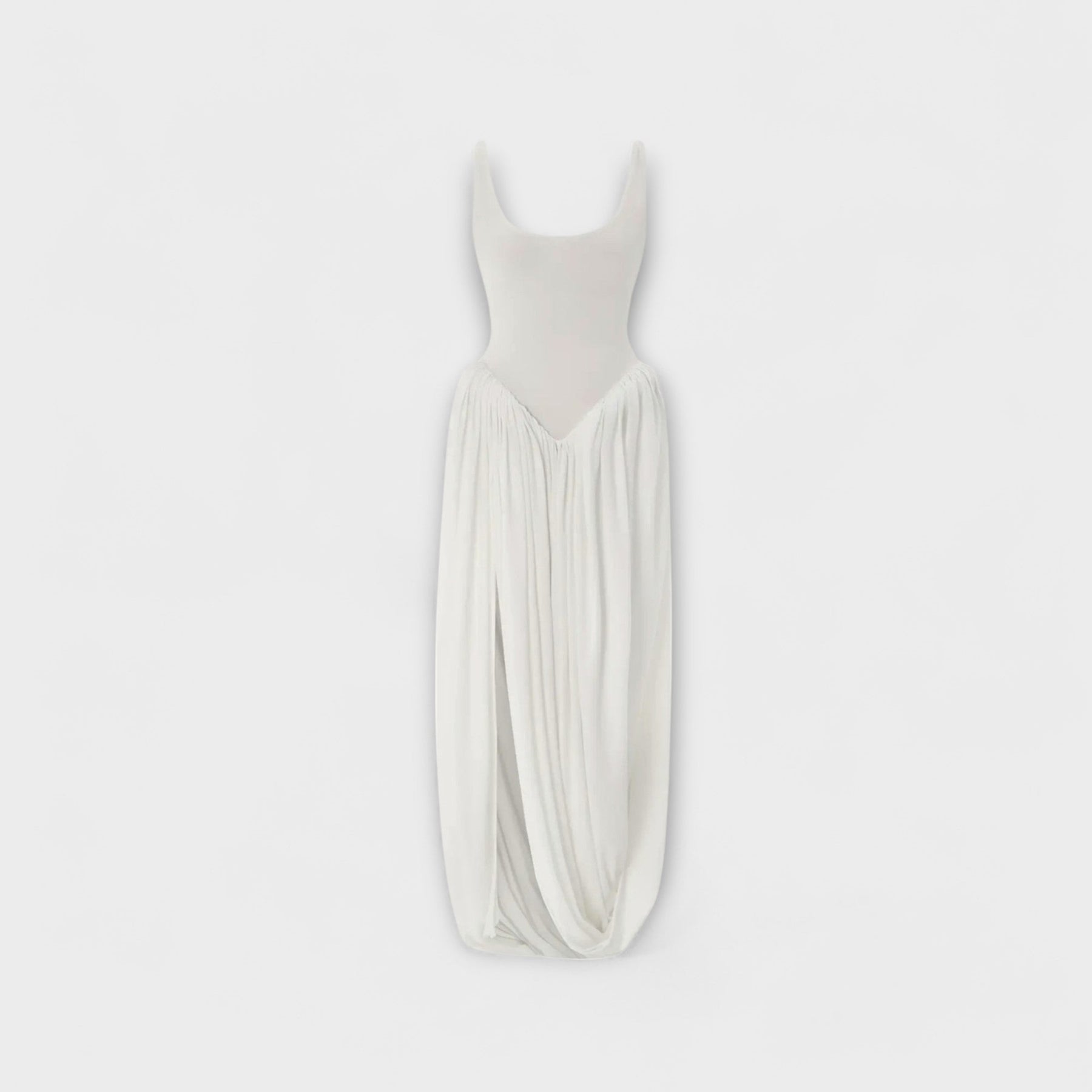 Entdecken Sie unser weißes drapiertes Maxikleid, das mit einem skulpturalen Rock und einem seitlichen Schlitz begeistert.