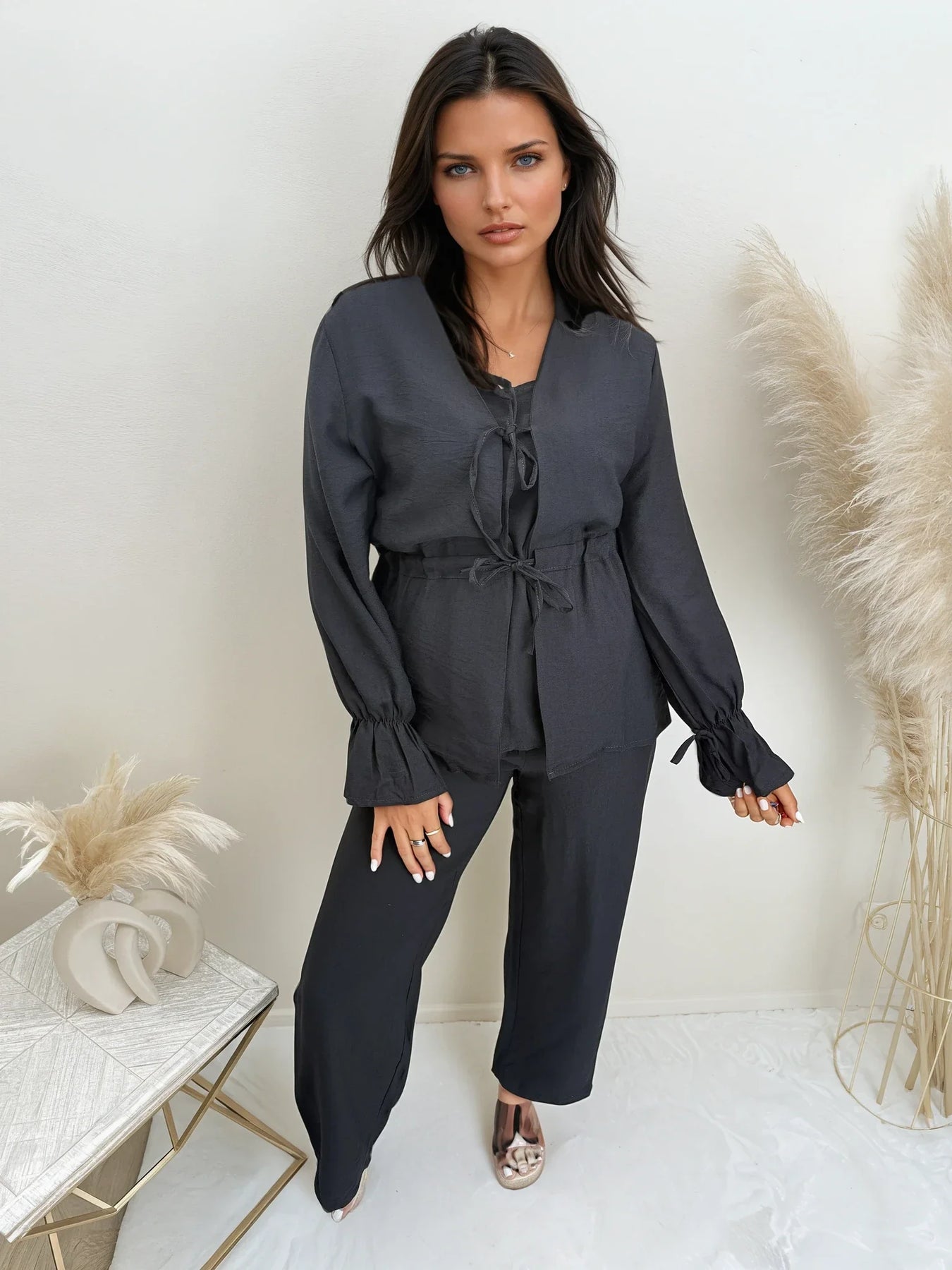Set bestehend aus 3 Teilen mit Hose, Oberteil und Cardigan im Schleifen-Trend.