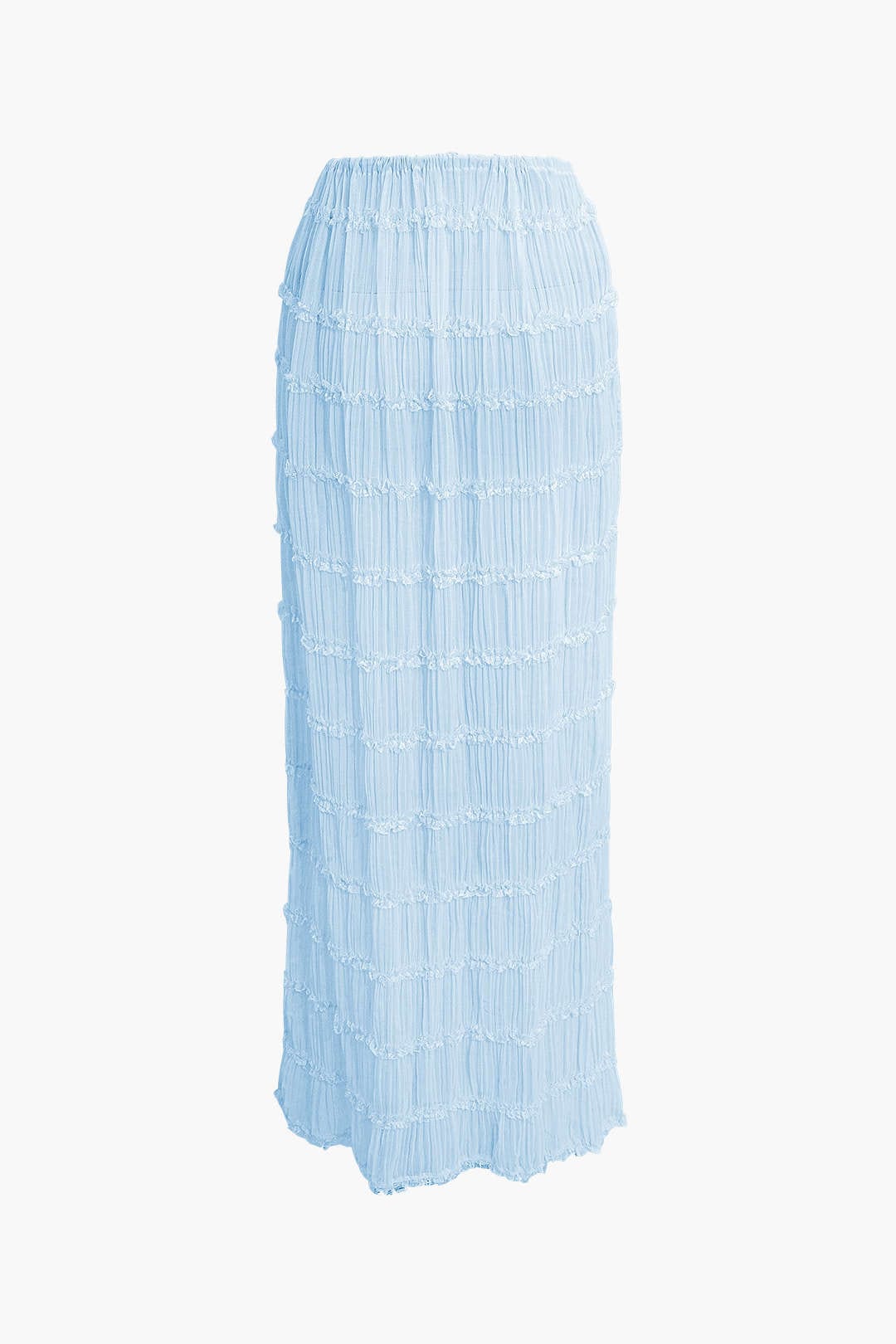 Das Elise Zweiteiler-Set vereint verspielte Leichtigkeit mit eleganter Raffinesse. Das luftige Plissee-Top mit zarten Bindebändern am Hals sorgt für eine feminine Ausstrahlung, während der fließende Maxirock mit elastischem Bund eine schmeichelhafte Passform bietet. Die feinen Rüschen und die durchdachte Faltenstruktur verleihen dem Set eine romantische Note, perfekt für Sommerabende, Strandspaziergänge oder elegante Gartenpartys.