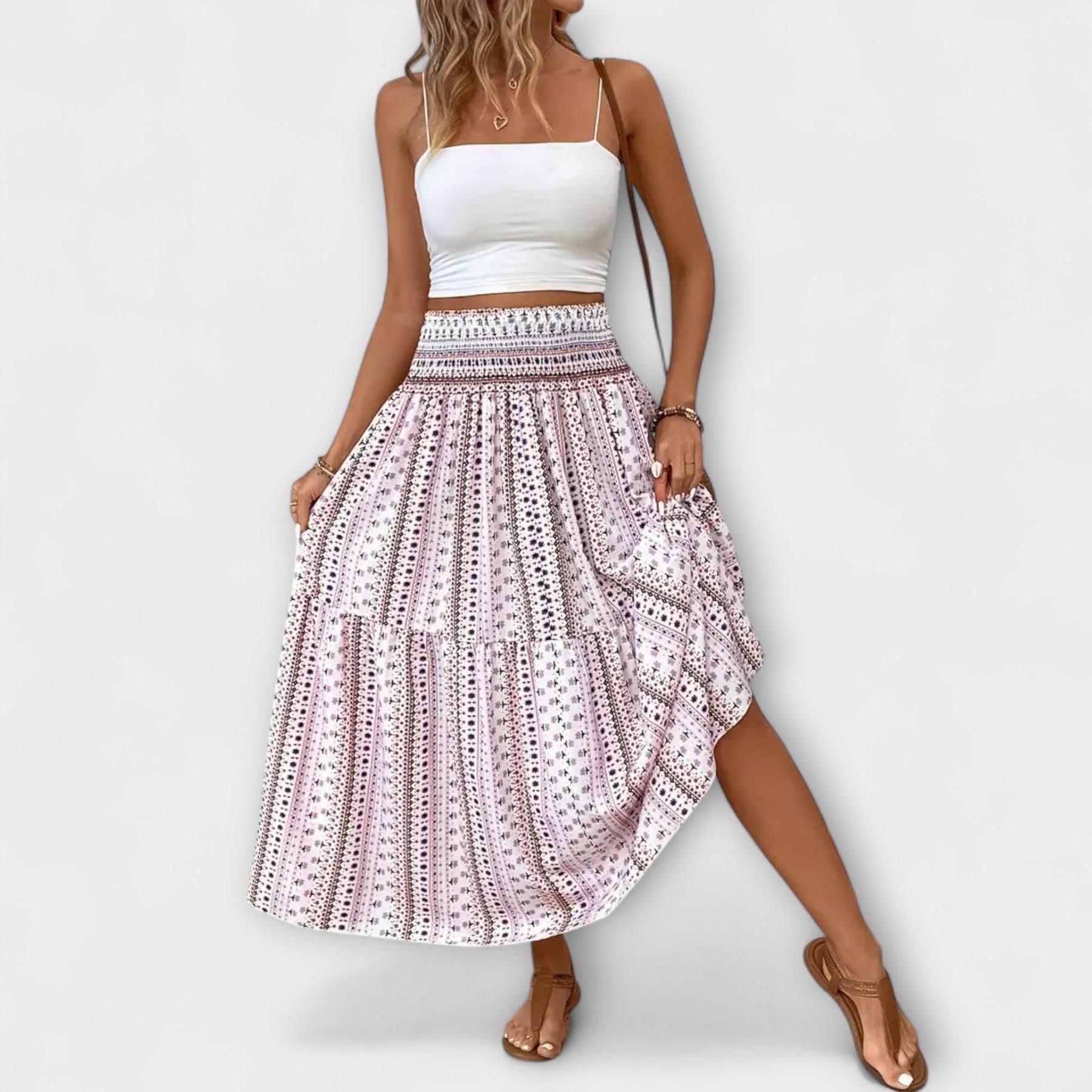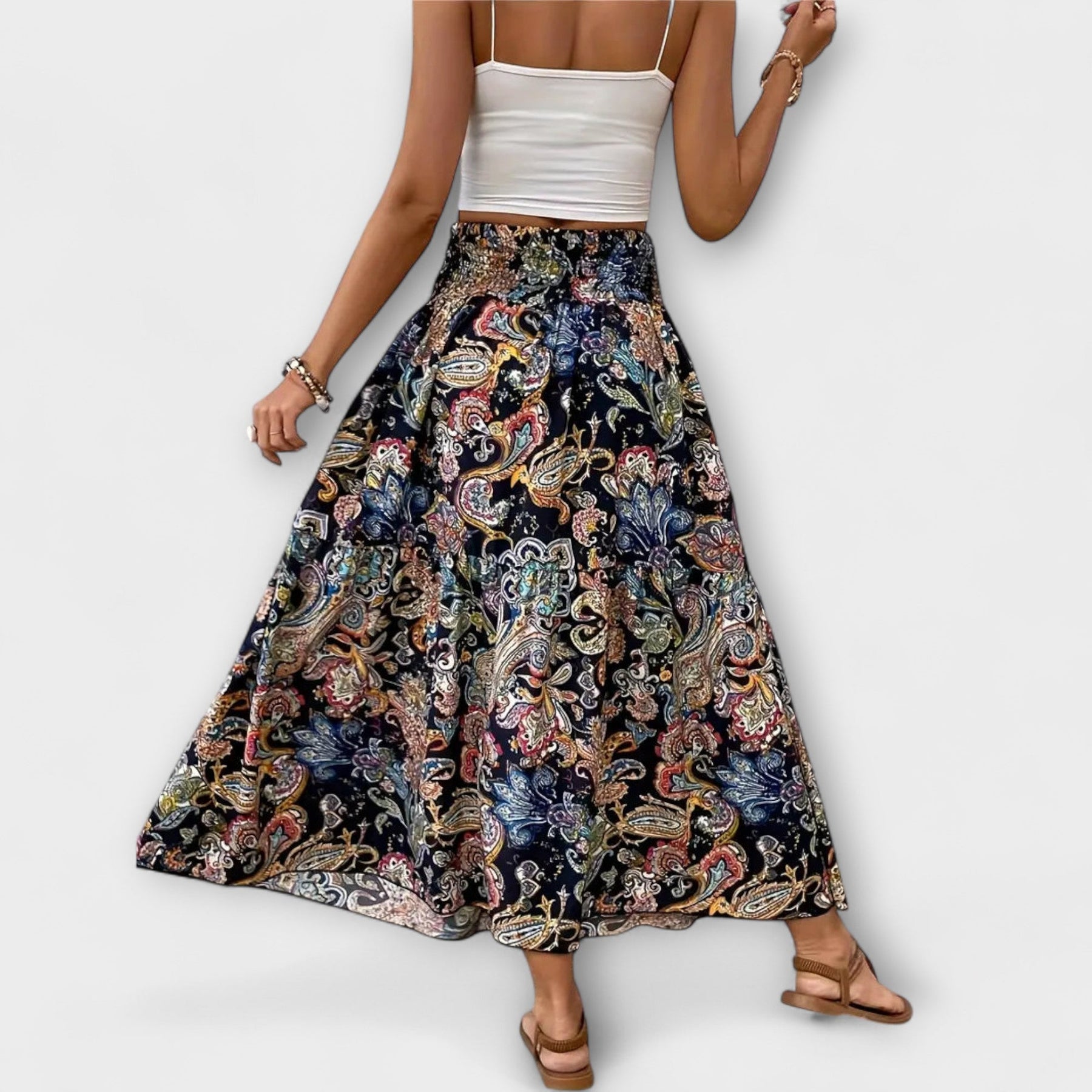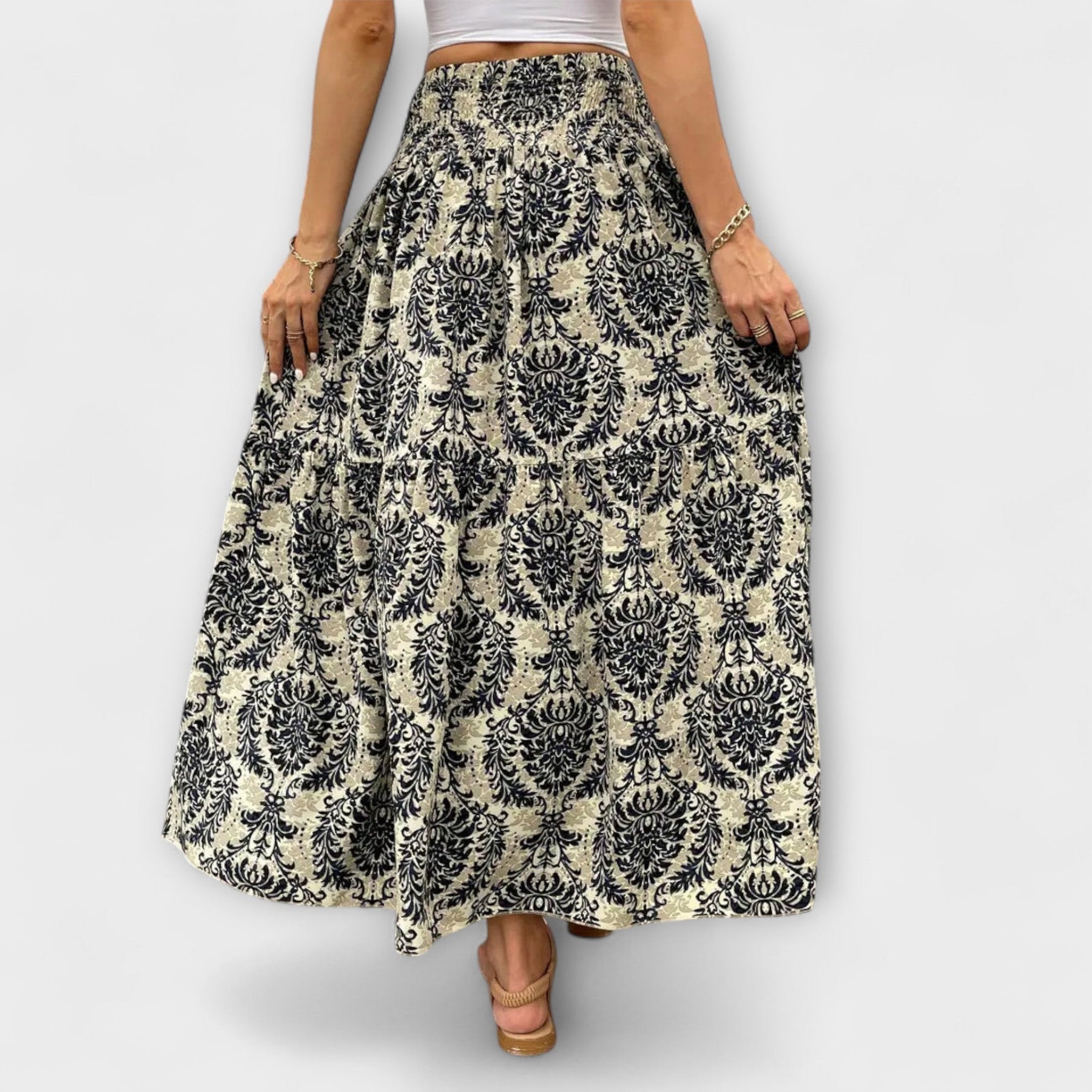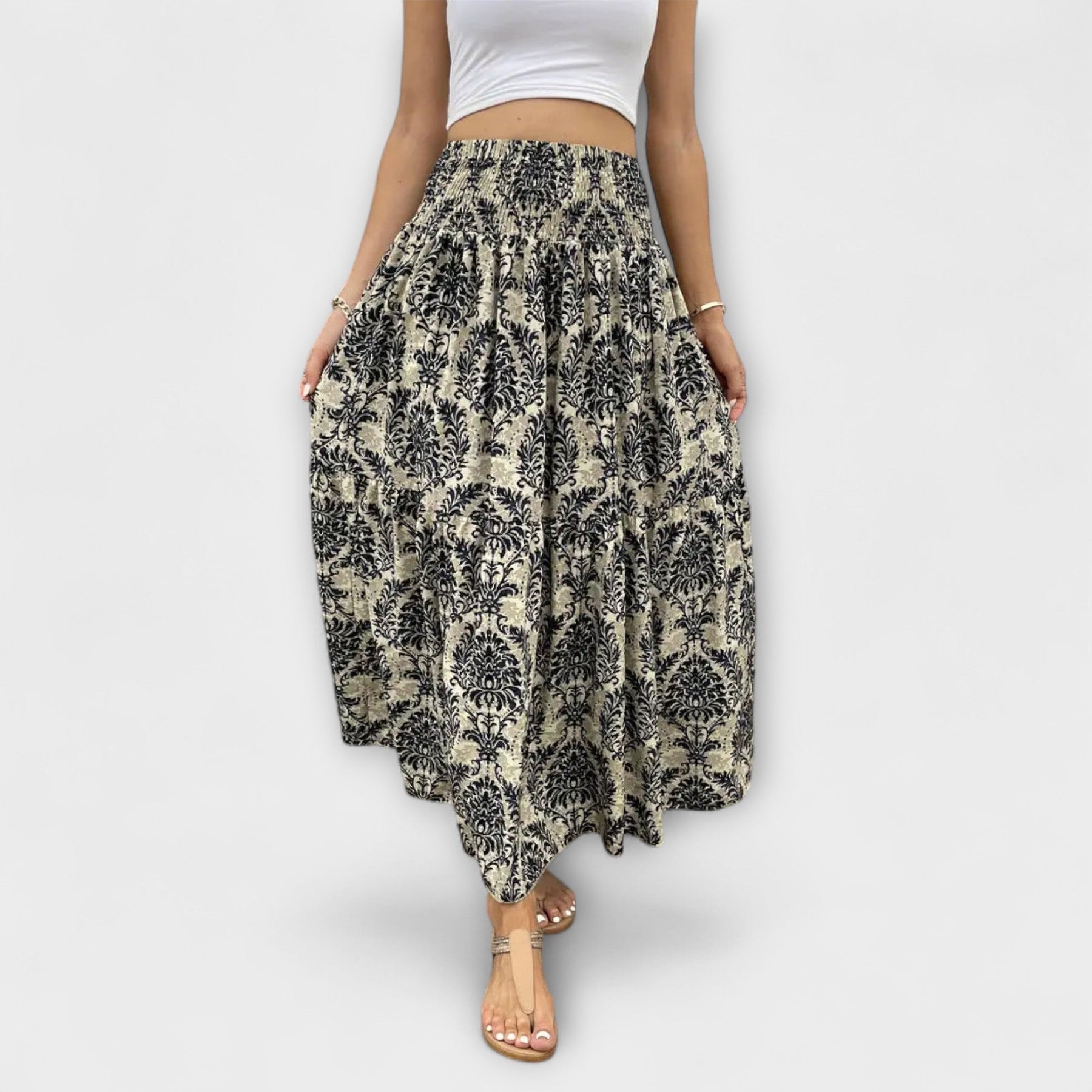 Entdecken Sie pure Bewegungsfreiheit mit diesem Rock, der Geschichten erzählt. Das einzigartige Muster und der fließende Stoff verleihen Ihrem Look eine Aura besonderer Anmut.