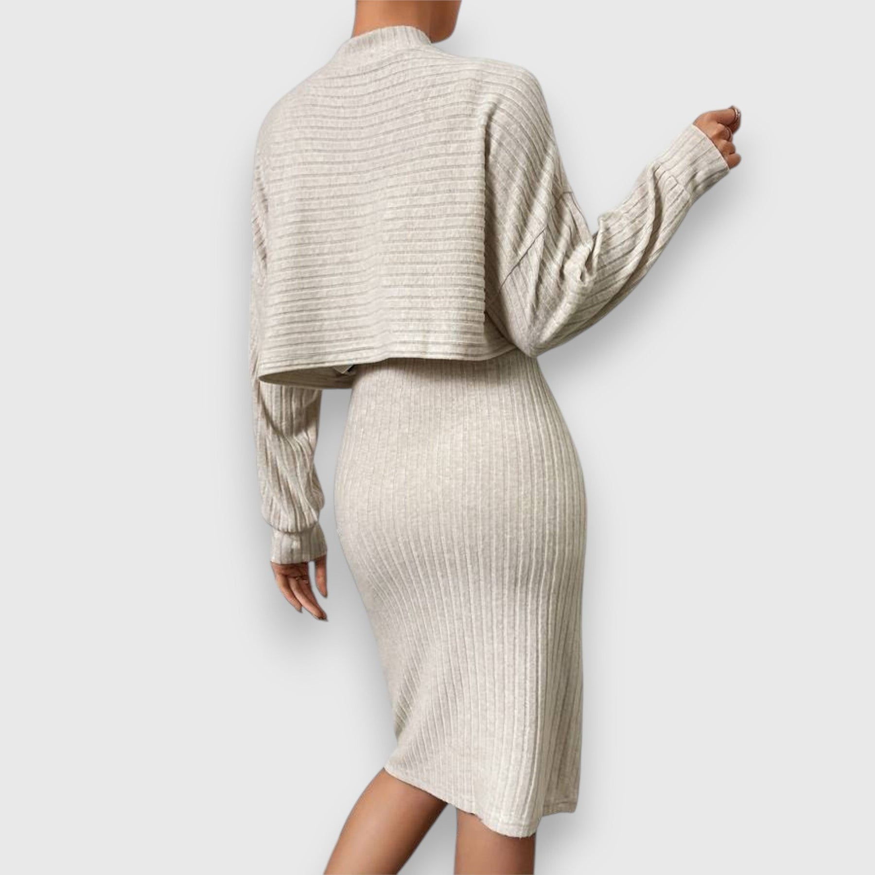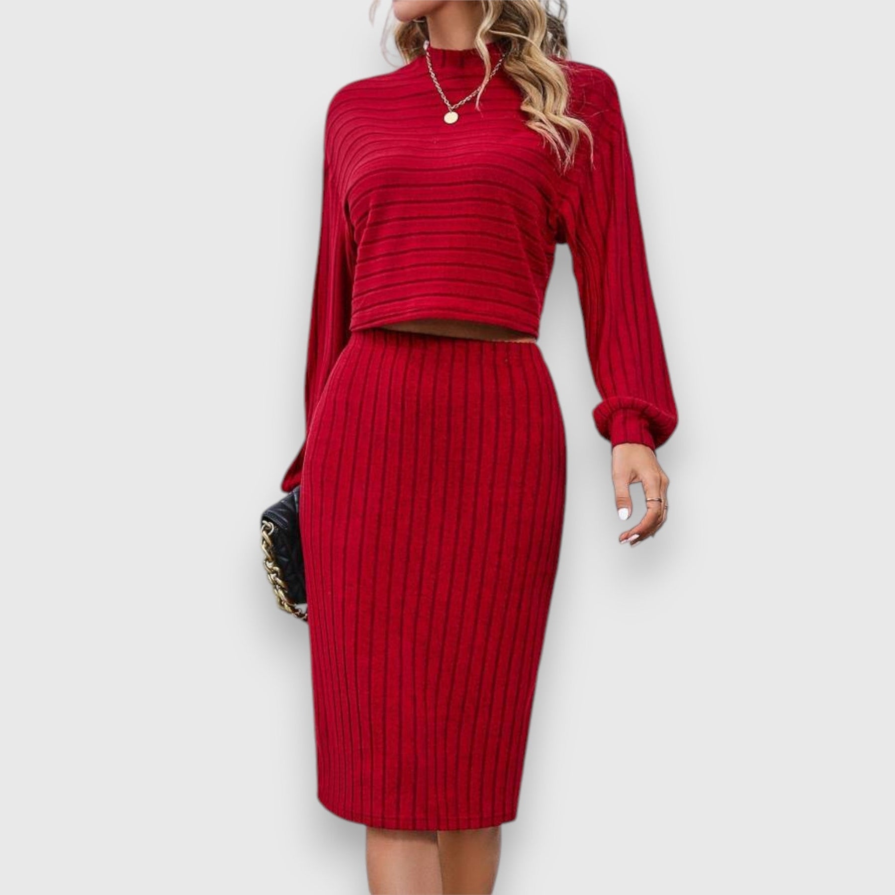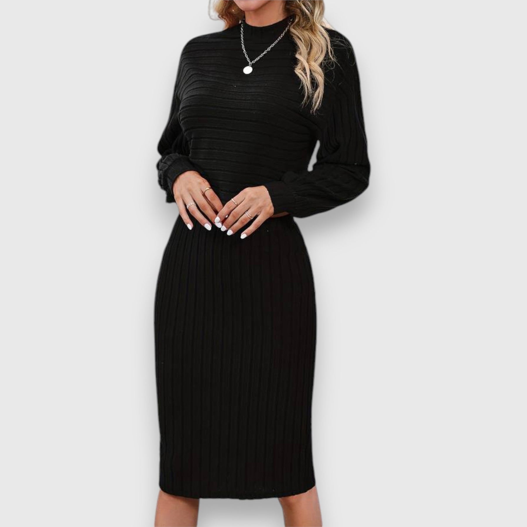 Das Helena-Set vereint Eleganz und Komfort in einem perfekten Zweiteiler für vielseitige Looks. Der lockere Pullover bietet ein gemütliches Tragegefühl, während der passende Rock eine schmeichelhafte Silhouette zaubert – ideal für legere und semi-formale Anlässe.