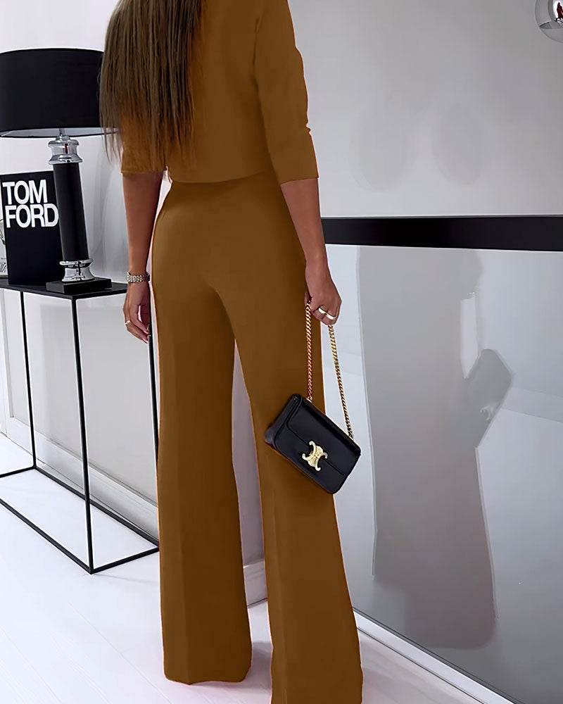 Gehen Sie selbstbewusst aus der Tür mit dem zweiteiligen Set Jennifer, einer Verschmelzung von Raffinesse und Komfort, die Sie mühelos von der Arbeit zu Veranstaltungen begleiten wird. Dieses Set besteht aus einer wunderschön gestalteten langen Hose und einem passenden Oberteil, perfekt für Frauen, die einen zeitlosen und dennoch modernen Look anstreben.