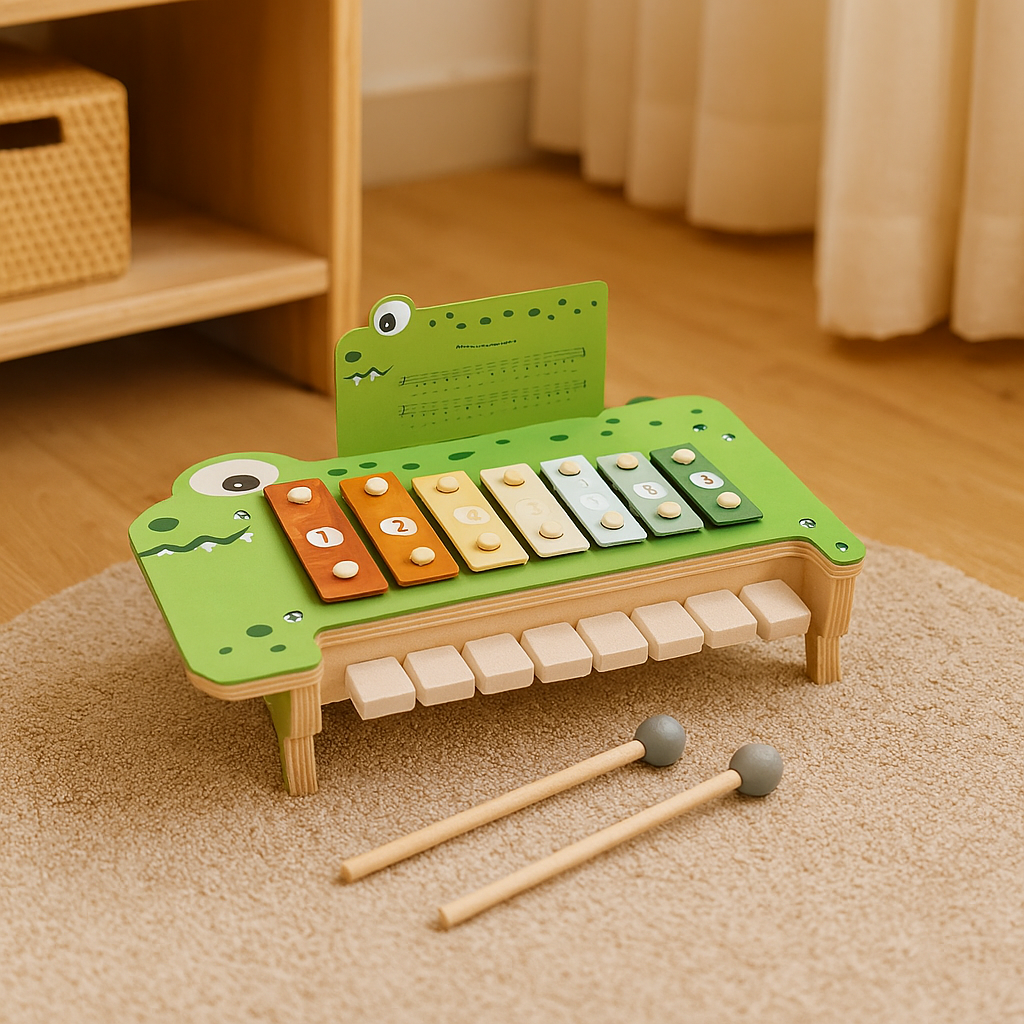Diese Musikbank ist perfekt für Kleinkinder von 1–4 Jahren. Sie bietet lebendige Töne und einen krokodilförmigen Holzrahmen, der die Fantasie anregt. Ob beim Schlagen der Bälle oder beim Spielen von Melodien mit dem mitgelieferten Schlägel – Kinder entwickeln auf sichere und anregende Weise Feinmotorik und Hörbewusstsein.