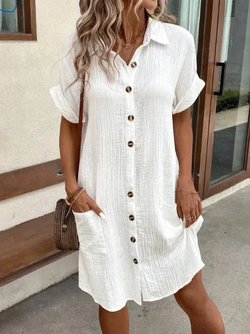 Stilvolles Hemdkleid mit Revers-Kragen: Dieses Kurzarm-Hemdkleid aus einer hochwertigen Baumwolle-Leinen-Mischung überzeugt durch seinen klassischen Revers-Kragen und ein lässiges Design. Ideal für den Alltag oder entspannte Anlässe.