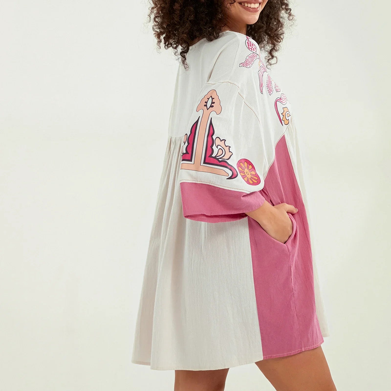Entdecken Sie die perfekte Verschmelzung von lässigem Komfort und stilvollem Boho-Design. Dieses Oversize-Minikleid mit 3/4 Ärmeln vereint mühelos Eleganz mit Alltagstauglichkeit. Die fließende Silhouette schmeichelt jeder Figur und schafft einen zeitlosen Look, der von morgens bis abends überzeugt.