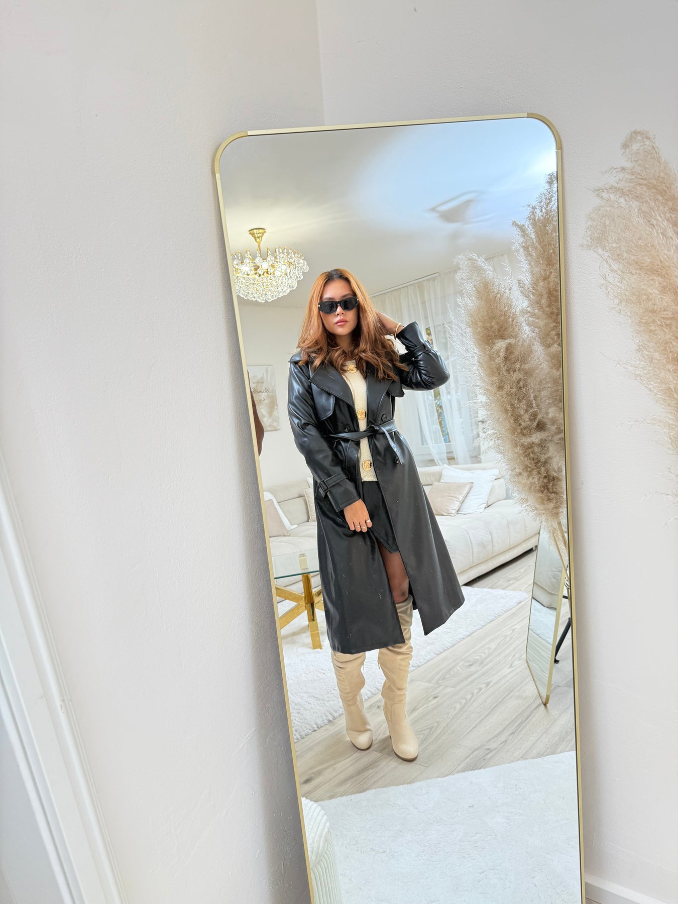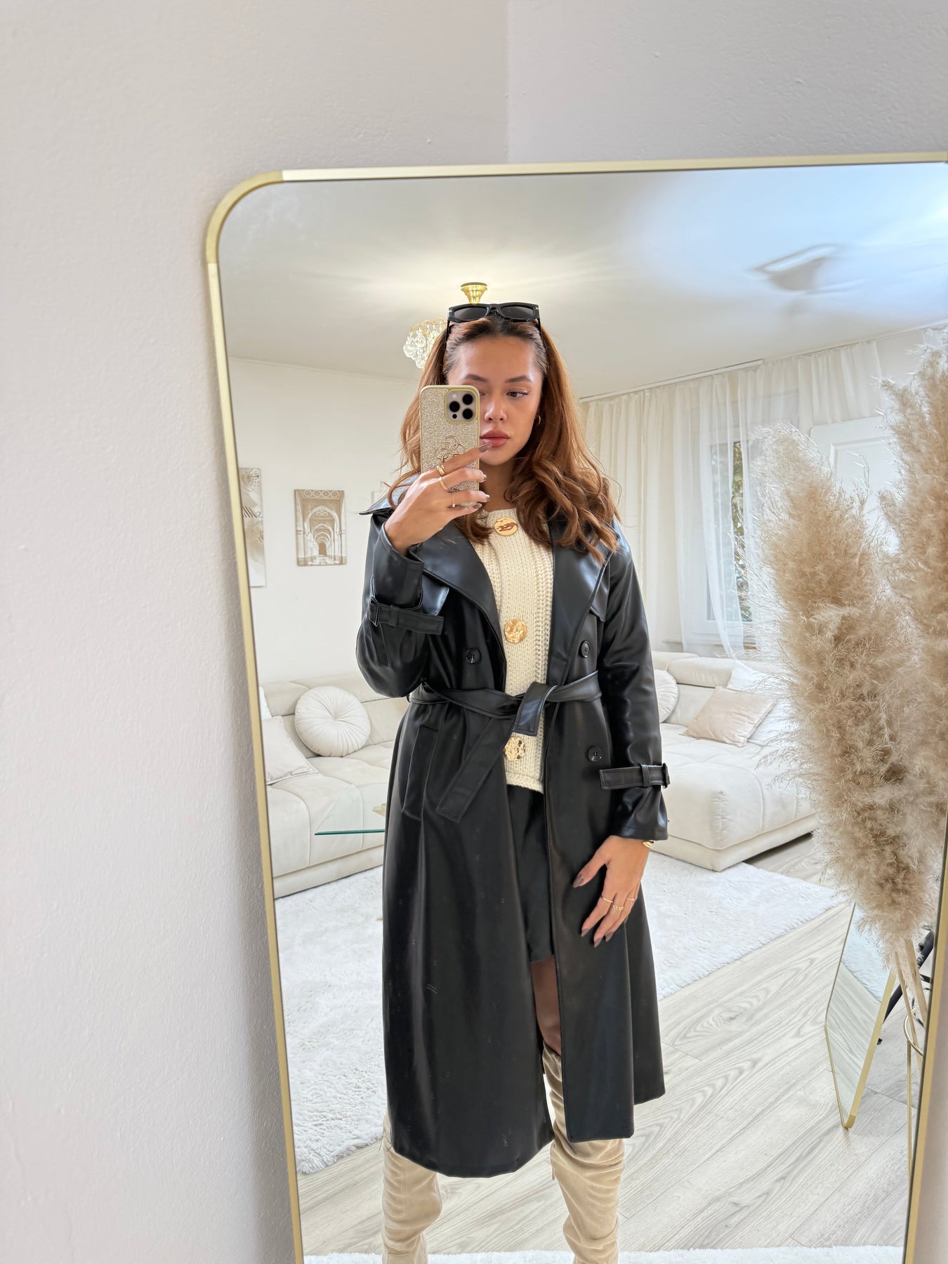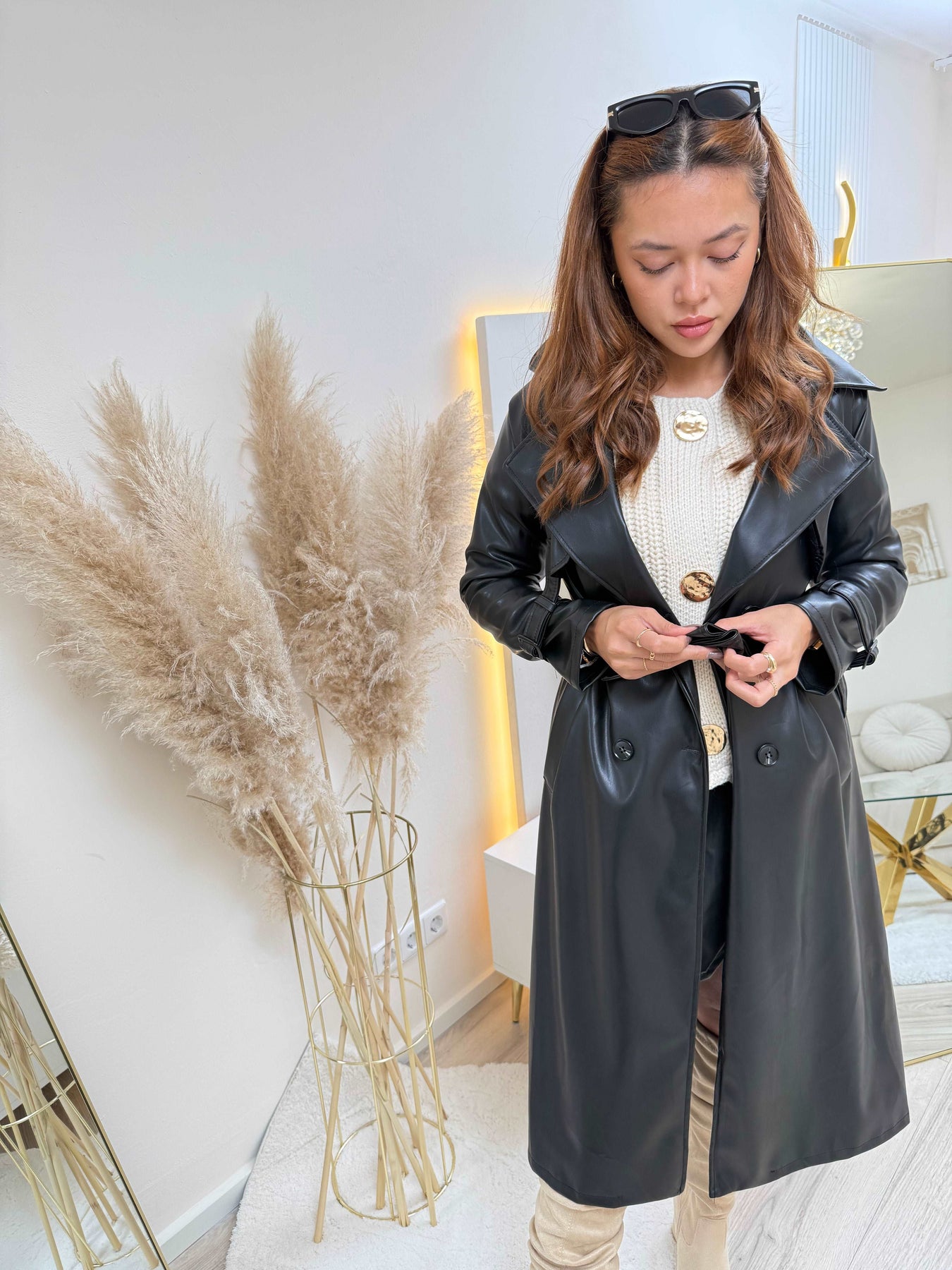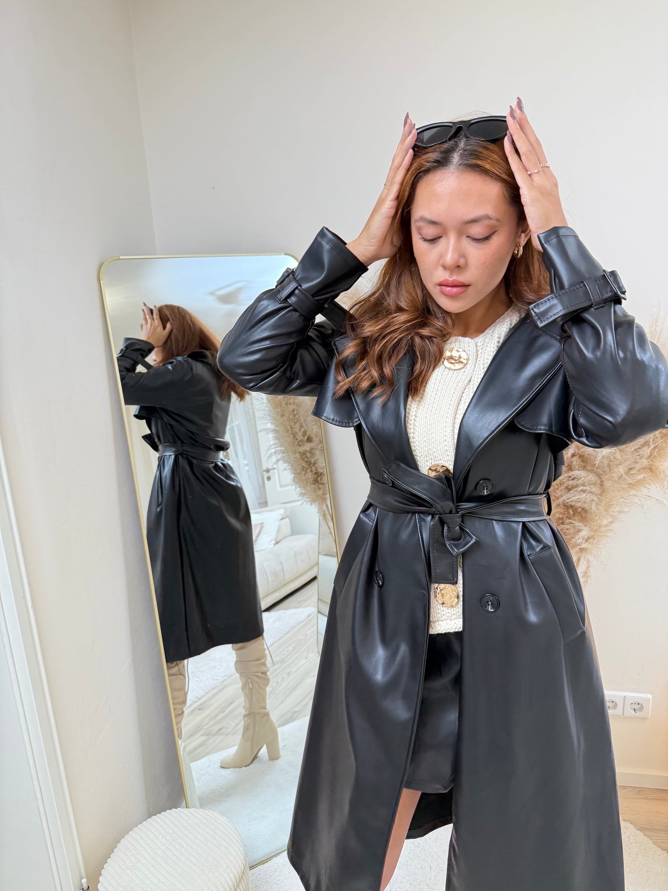 Mit seinem modernen Trenchcoat-Schnitt kombiniert der Leder-Mantel zeitlose Eleganz mit urbanem Streetstyle. Der Schnitt betont deine Figur, während das hochwertige Kunstleder dem Mantel einen luxuriösen Touch verleiht. Egal, ob du dich für ein klassisches Business-Outfit oder einen lässigen Alltagslook entscheidest – dieser Mantel setzt stets modische Akzente und macht dich zum Trendsetter.