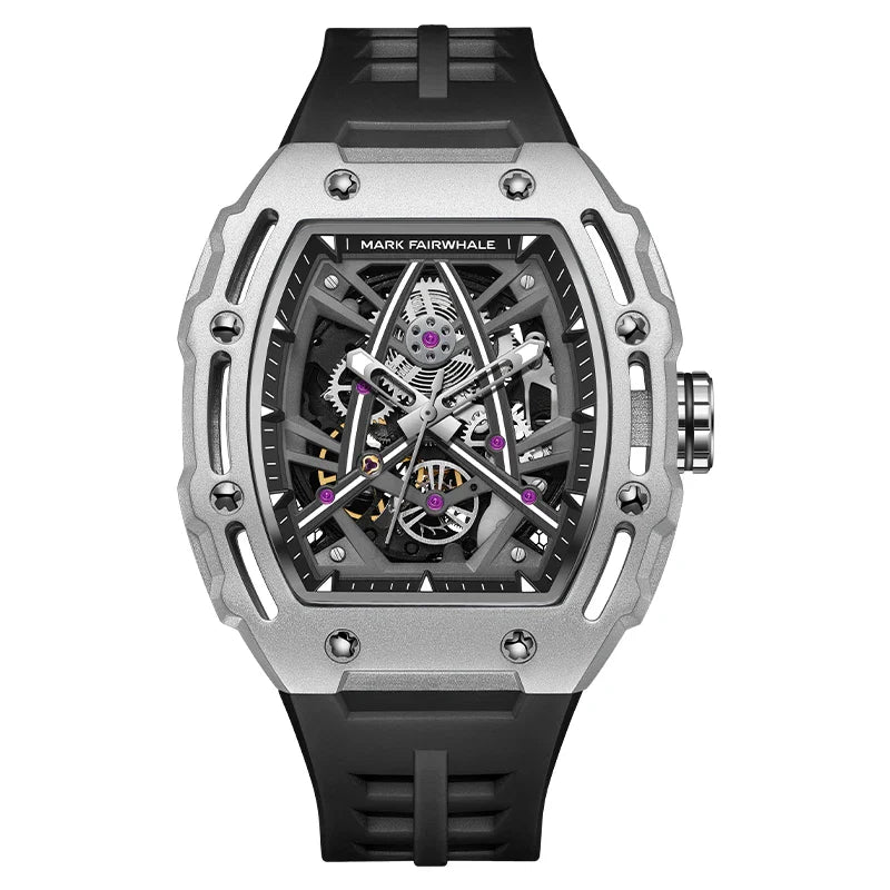 Mark Fairwhale Herren Uhr mit Mechanischem Movement, Skelett-Design, Wasserdicht, Gummiarmband, Tonneau-Form