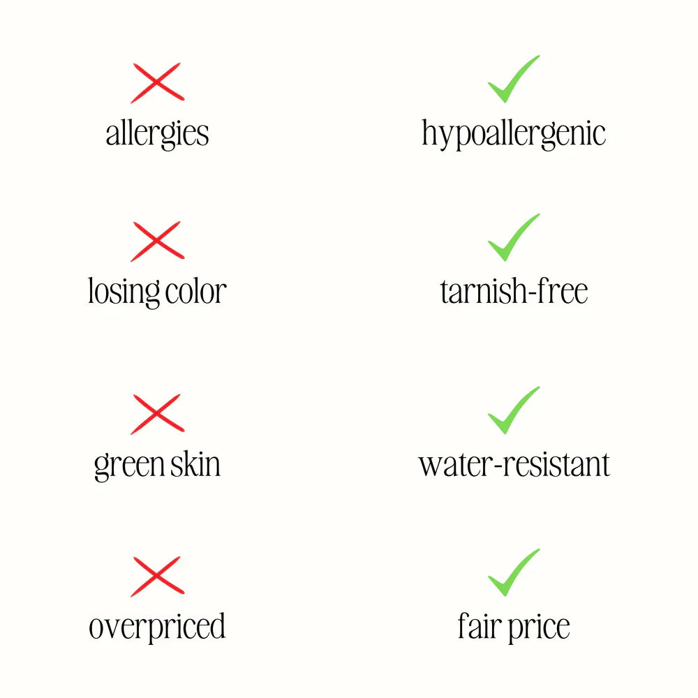 Unser Schmuck ist so konzipiert, dass er dem täglichen Verschleiß standhält. Er ist 100% schweiß- und wasserfest, hitzebeständig und kann ohne Bedenken mit Parfüm und Lotion getragen werden. Er ist 10-mal stärker als herkömmlicher Schmuck.