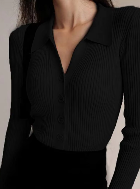 - Design: Knopfkragen und V-Ausschnitt