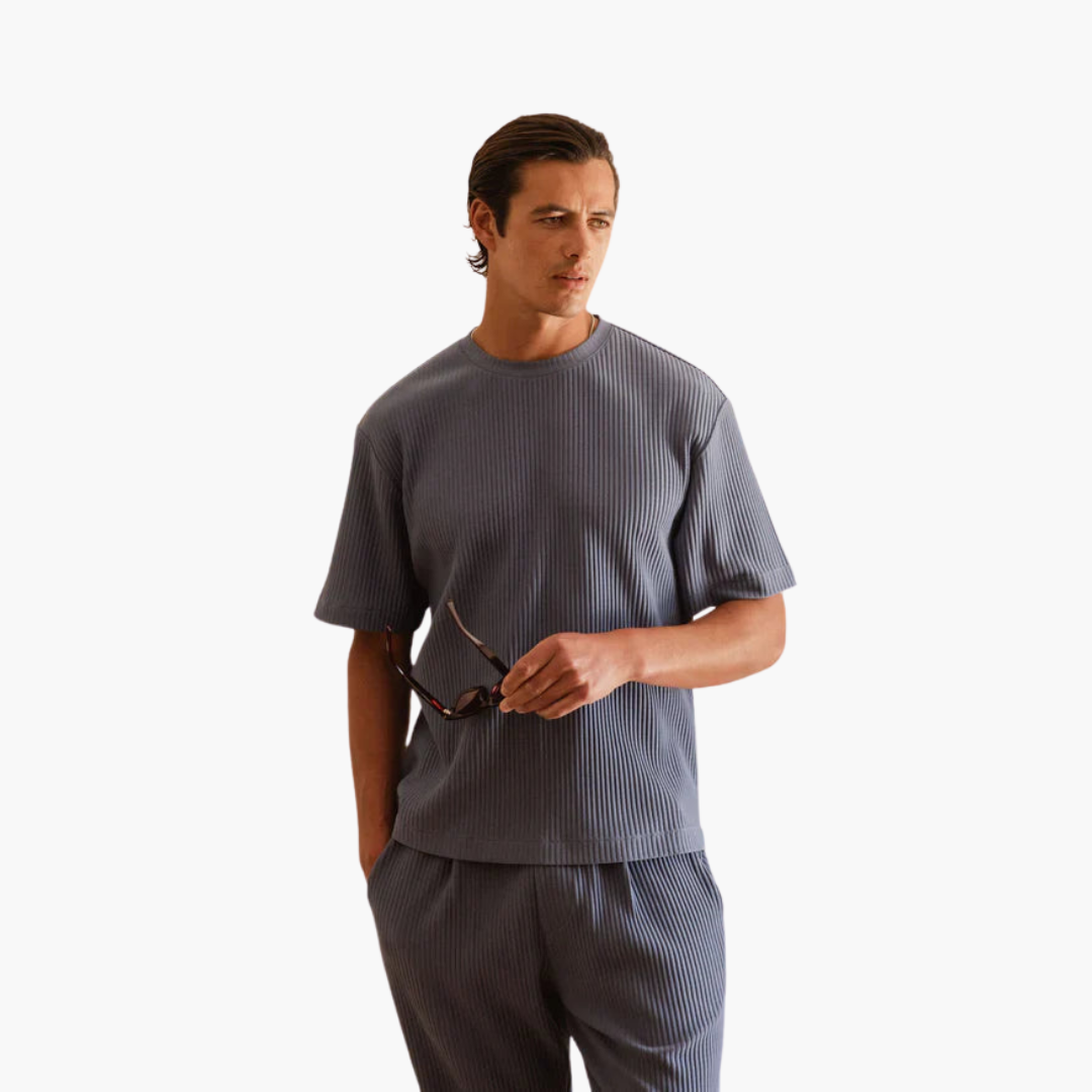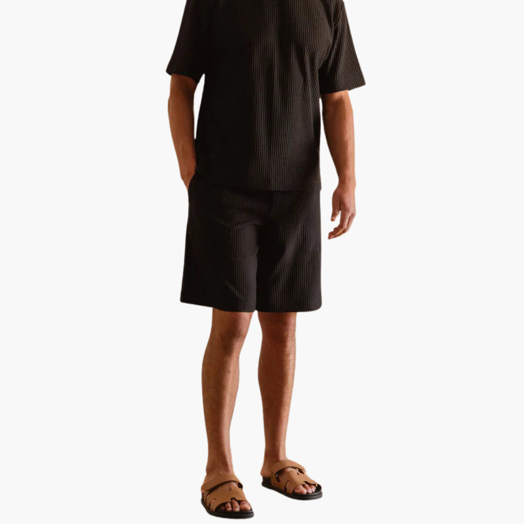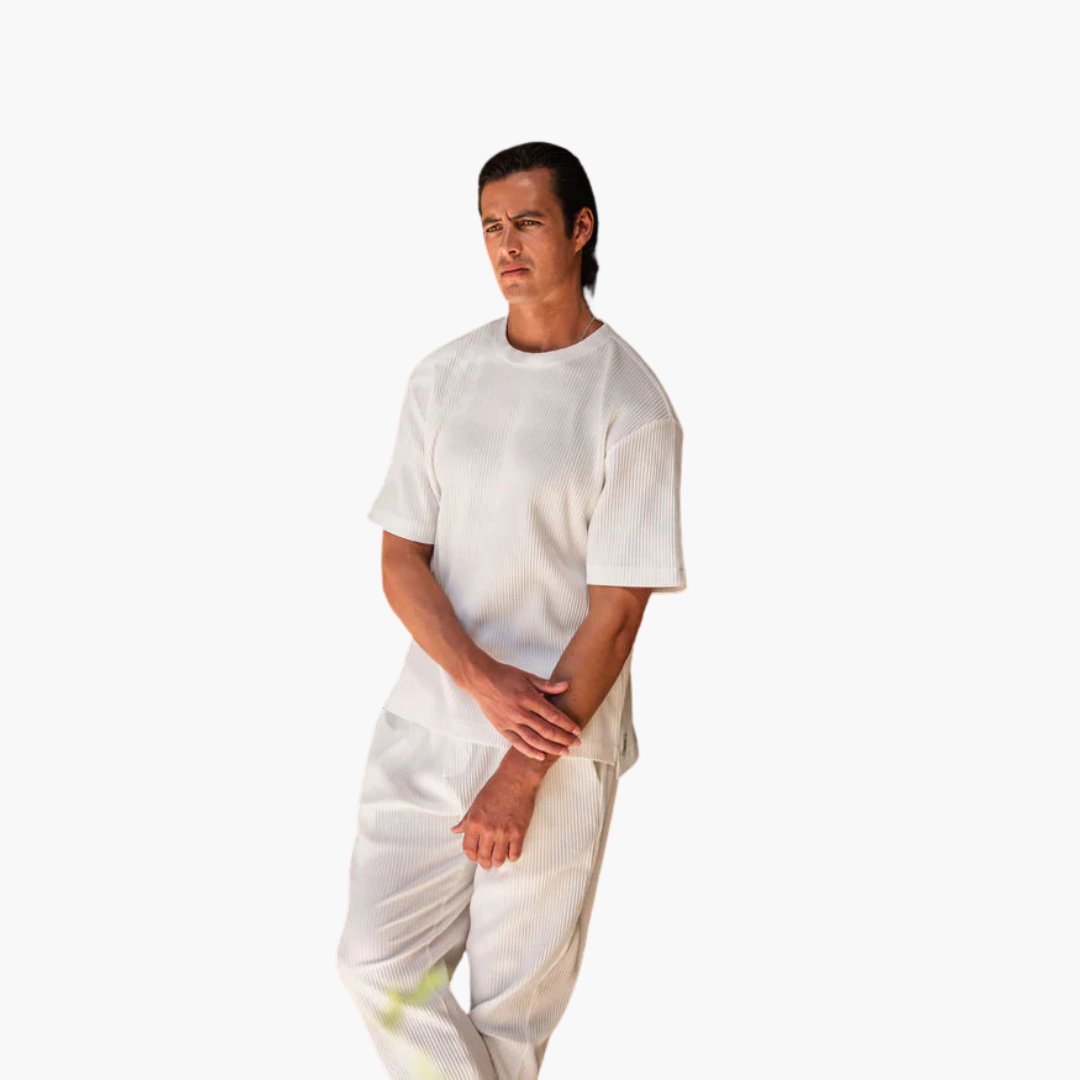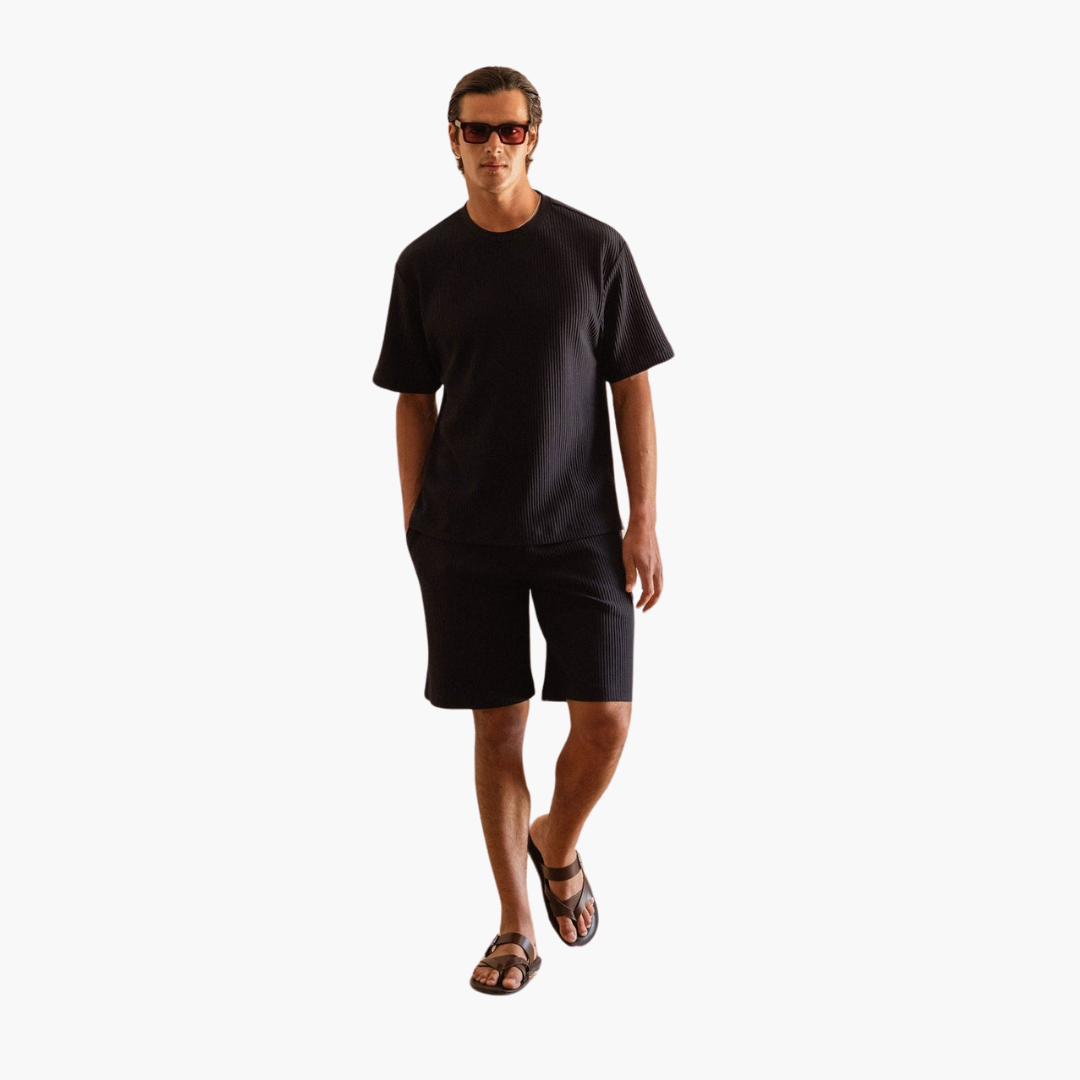 Starten Sie selbstbewusst in den Sommer mit unserem plissierten Zweiteiler mit Kurzarmhemd – die perfekte Kombination aus polierter Raffinesse und entspanntem Komfort. Für den modernen Mann entworfen, bietet dieses Set Vielseitigkeit und ist ideal für alles, von legeren Ausflügen bis hin zur Entspannung zu Hause. Das atmungsaktive Material sorgt dafür, dass Sie den ganzen Tag kühl und stilvoll bleiben.