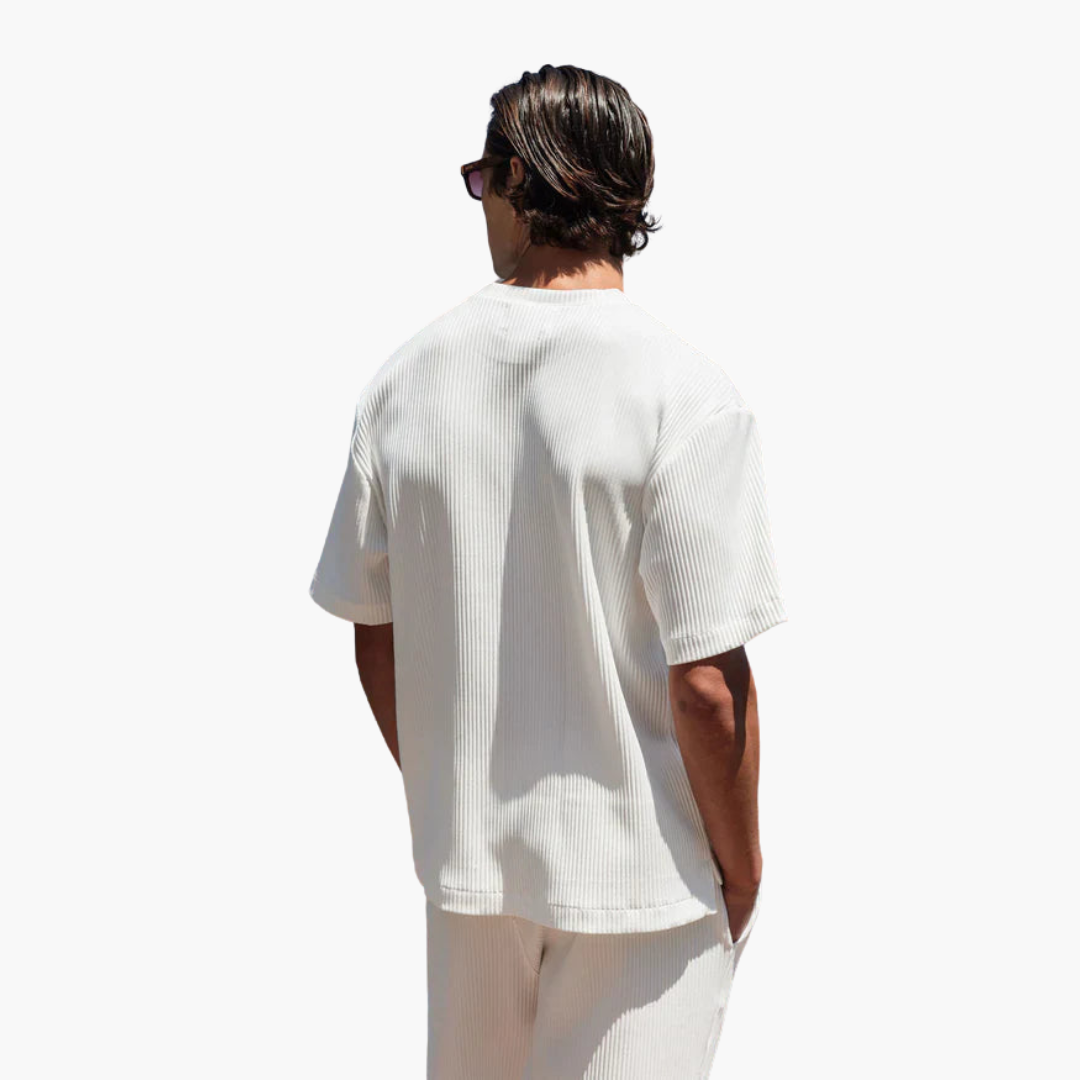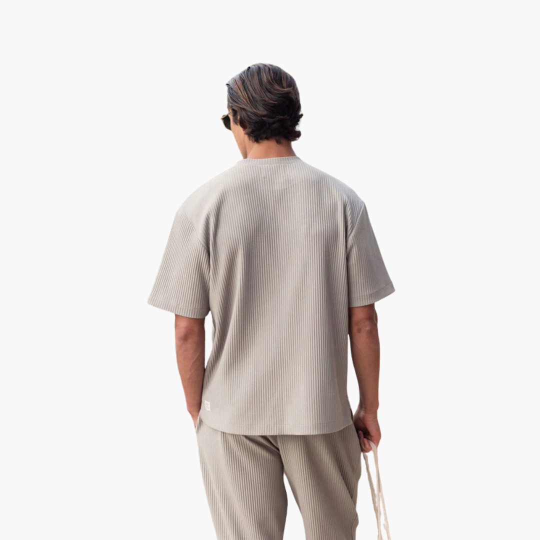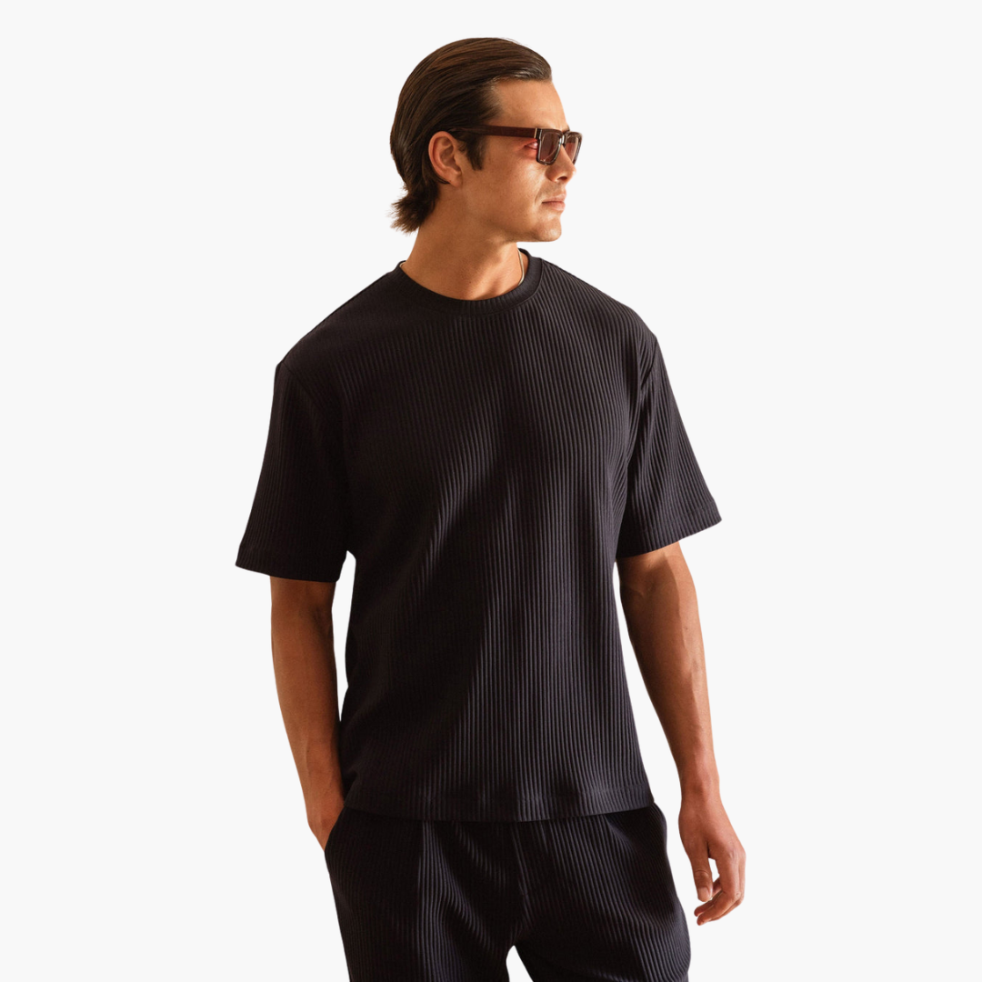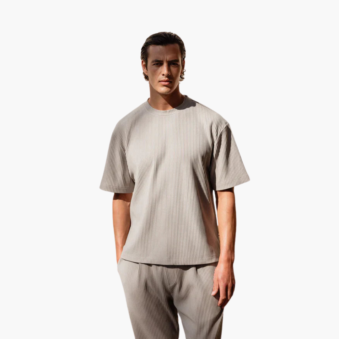 Starten Sie selbstbewusst in den Sommer mit unserem plissierten Zweiteiler mit Kurzarmhemd – die perfekte Kombination aus polierter Raffinesse und entspanntem Komfort. Für den modernen Mann entworfen, bietet dieses Set Vielseitigkeit und ist ideal für alles, von legeren Ausflügen bis hin zur Entspannung zu Hause. Das atmungsaktive Material sorgt dafür, dass Sie den ganzen Tag kühl und stilvoll bleiben.