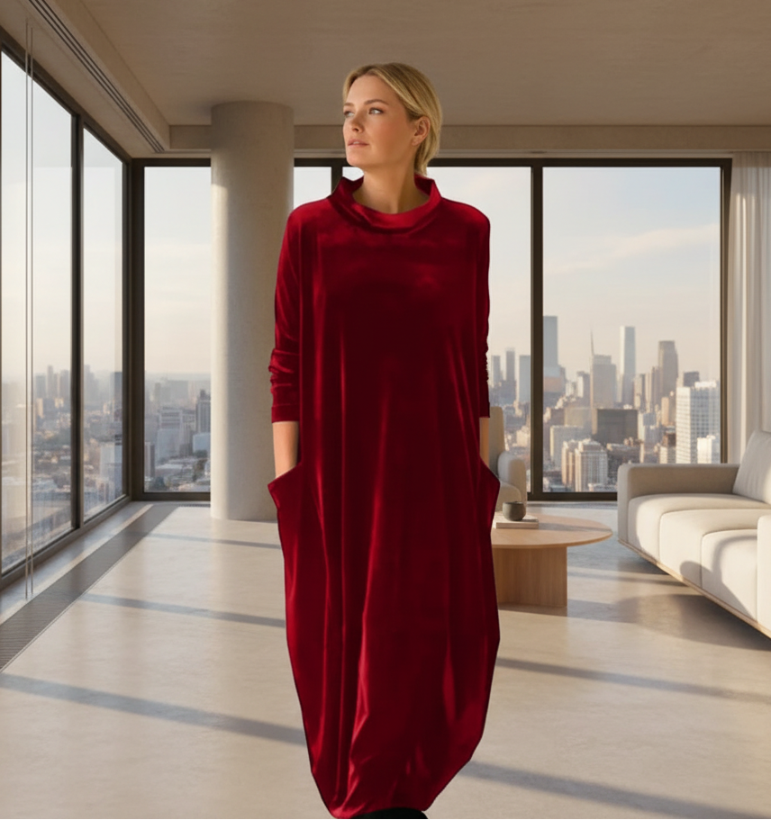 Das Ruby Langarmkleid bietet einen gehobenen Look mit seinem luxuriösen Stoff und seinem bequemen, fließenden Schnitt. Dieses Stück ist perfekt, um eine anspruchsvolle Silhouette zu schaffen, während die Bewegungsfreiheit erhalten bleibt. Mit einem hohen Ausschnitt und praktischen Seitentaschen ist dieses Kleid eine vielseitige Option für kühleres Wetter, das sich leicht mit Schmuck und Stiefeln für jeden besonderen Anlass oder Abend aufwerten lässt.