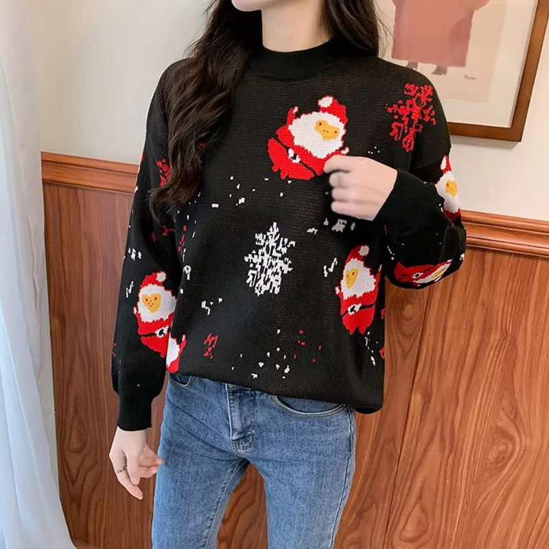 - Winterliches Design: Schneeflocken und weihnachtliche Akzente verleihen diesem Pullover eine festliche Note.