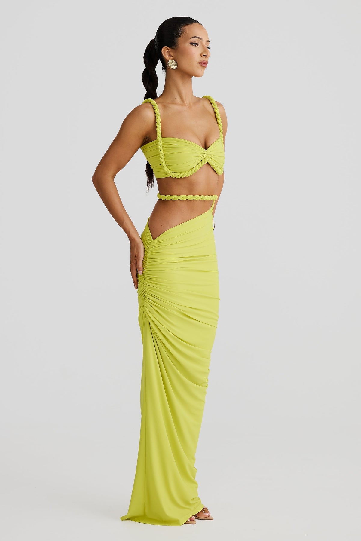 Ein elegantes zweiteiler-set für moderne momente. dieses figurschmeichelnde zweiteilige outfit verbindet trendige raffungen mit luxuriösem minimalismus. ob urlaub, event oder sommerabend – das set betont deine silhouette auf stilvolle weise. der drapierte schnitt mit freiem rücken und taillenbetonung sorgt für einen unvergesslichen auftritt.