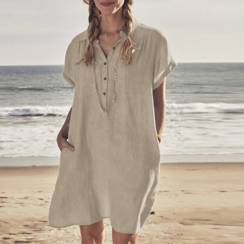 Lässiger Stil für sommerliche Tage: Dieses sommerliche Knopfkleid überzeugt mit einem entspannten Design und praktischen Knopfdetails, die Ihrem Outfit eine moderne und stilvolle Note verleihen. Perfekt für Freizeit oder entspannte Anlässe.
