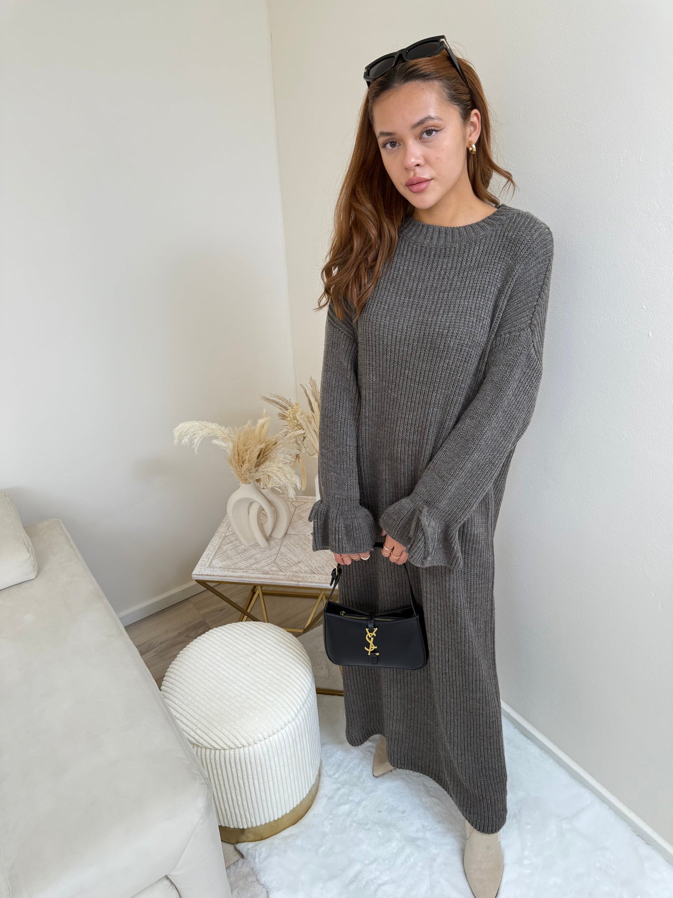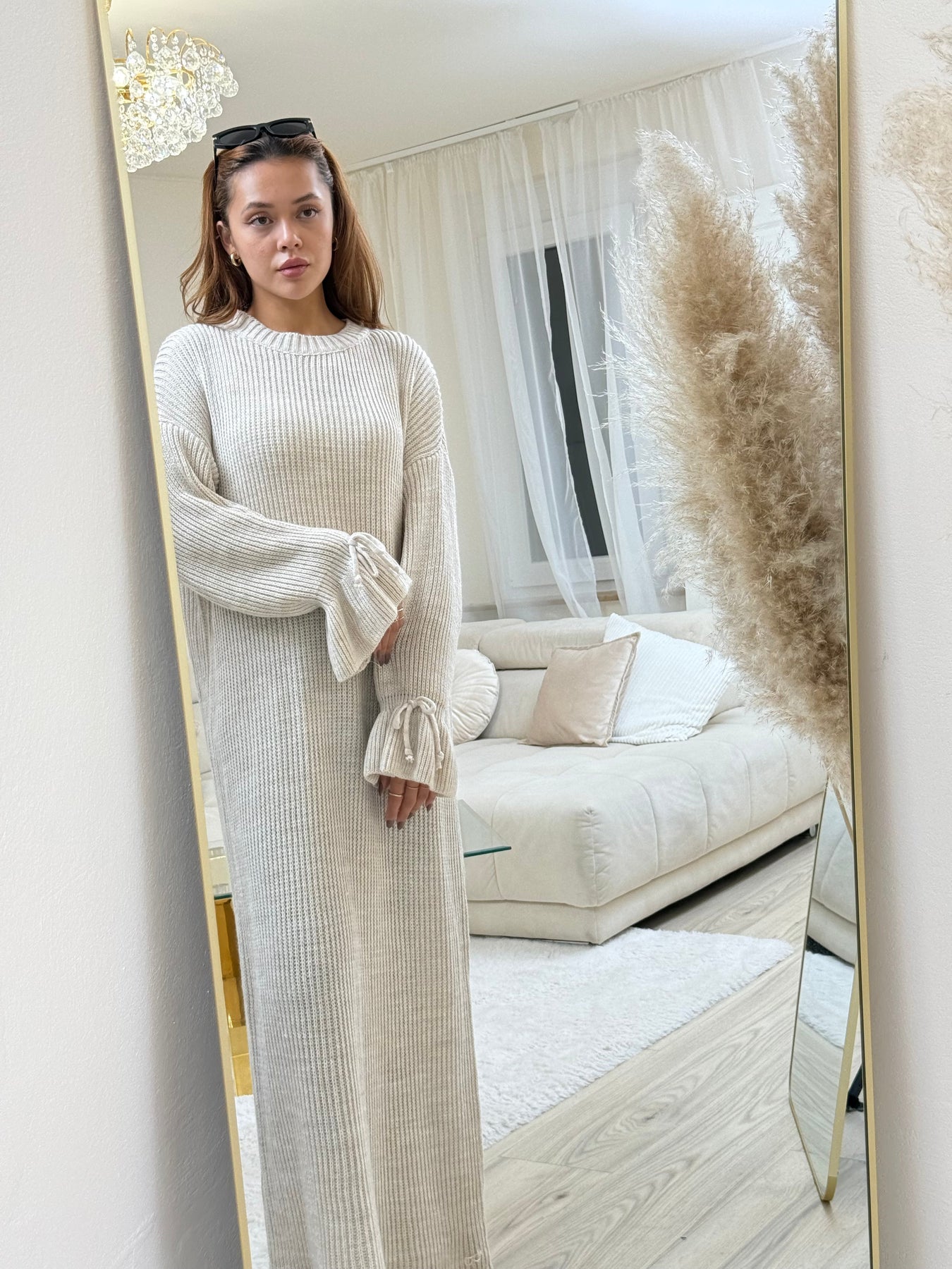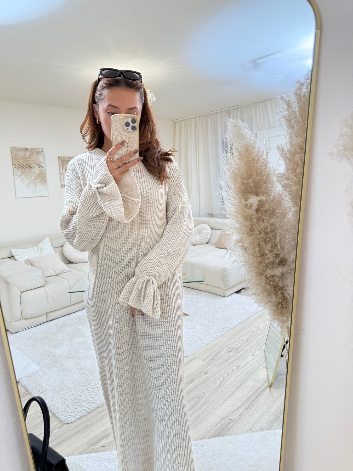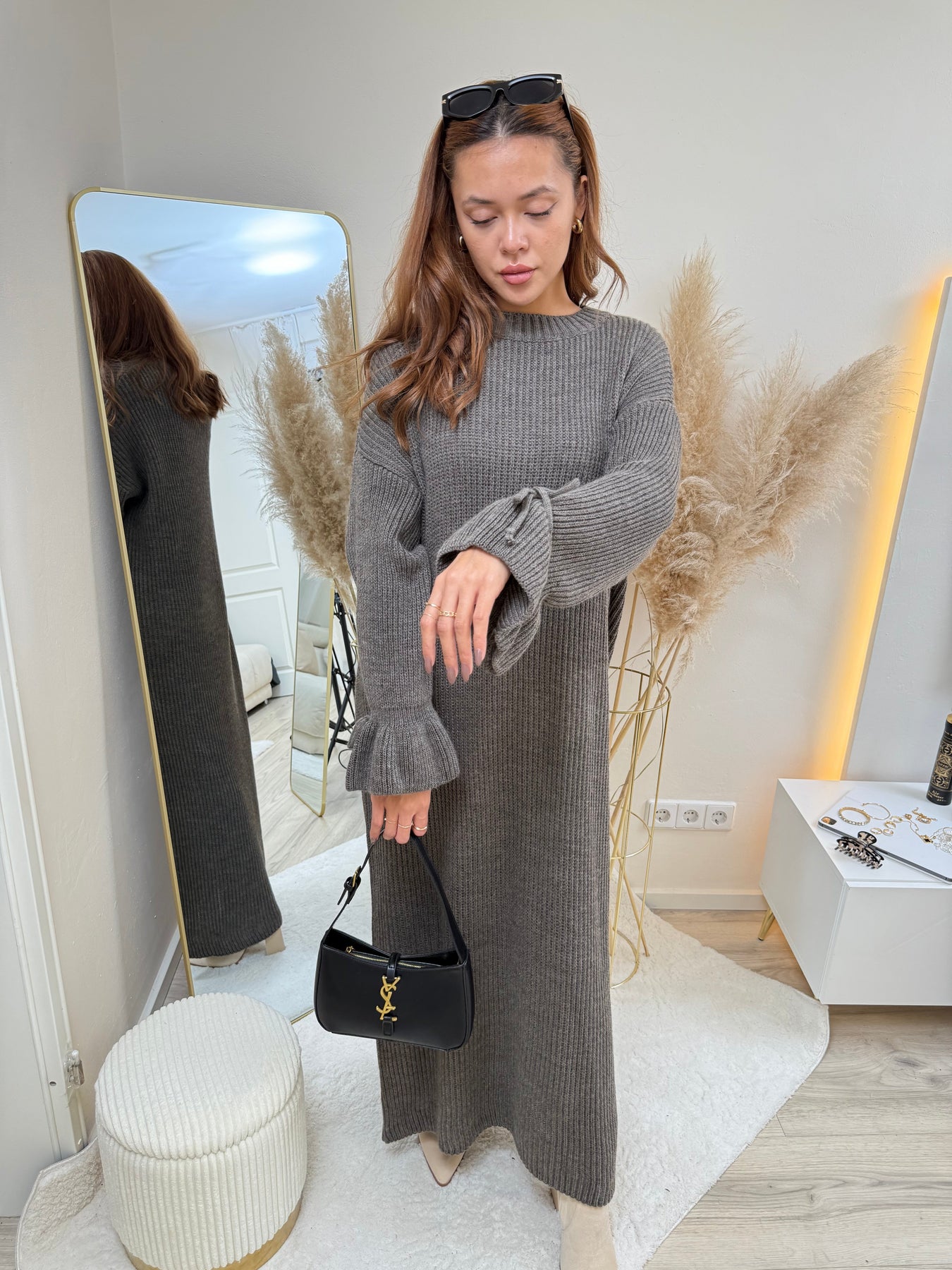 Tauche ein in die Welt des Wohlfühlens und der zeitlosen Eleganz – unser Strick-Kleid mit Ballonärmeln ist dein perfektes Fashion-Statement für alle, die Stil und Komfort gleichermaßen schätzen. Dieses atemberaubende Kleid, das durch seinen weichen Grobstrick und die auffälligen Ballonärmel besticht, ist das Must-Have-Piece der Saison, das dich an kühlen Tagen warm und modisch begleitet.