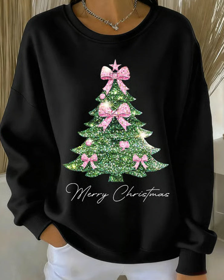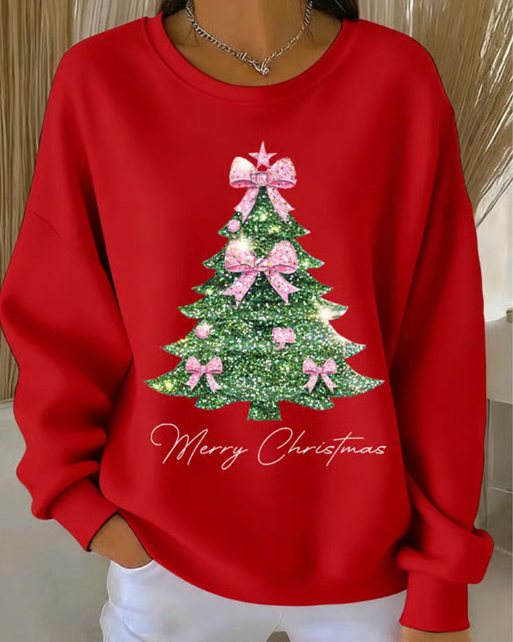 Der Trisa Rundhals-Pullover mit Weihnachtsbaum-Druck ist eine entzückende Ergänzung für die Feiertage, die maximale festliche Stimmung und mühelosen, gemütlichen Komfort bieten soll. Dieser Pullover verfügt über einen einfachen Rundhalsausschnitt und lange Ärmel, gefertigt aus einem weichen Stoff, der bequemes Tragen gewährleistet. Die Vorderseite ist mit einer großen, festlichen Weihnachtsbaum-Grafik verziert, die ein glitzerndes Finish und ein angebrachtes Schleifendetail aufweist.