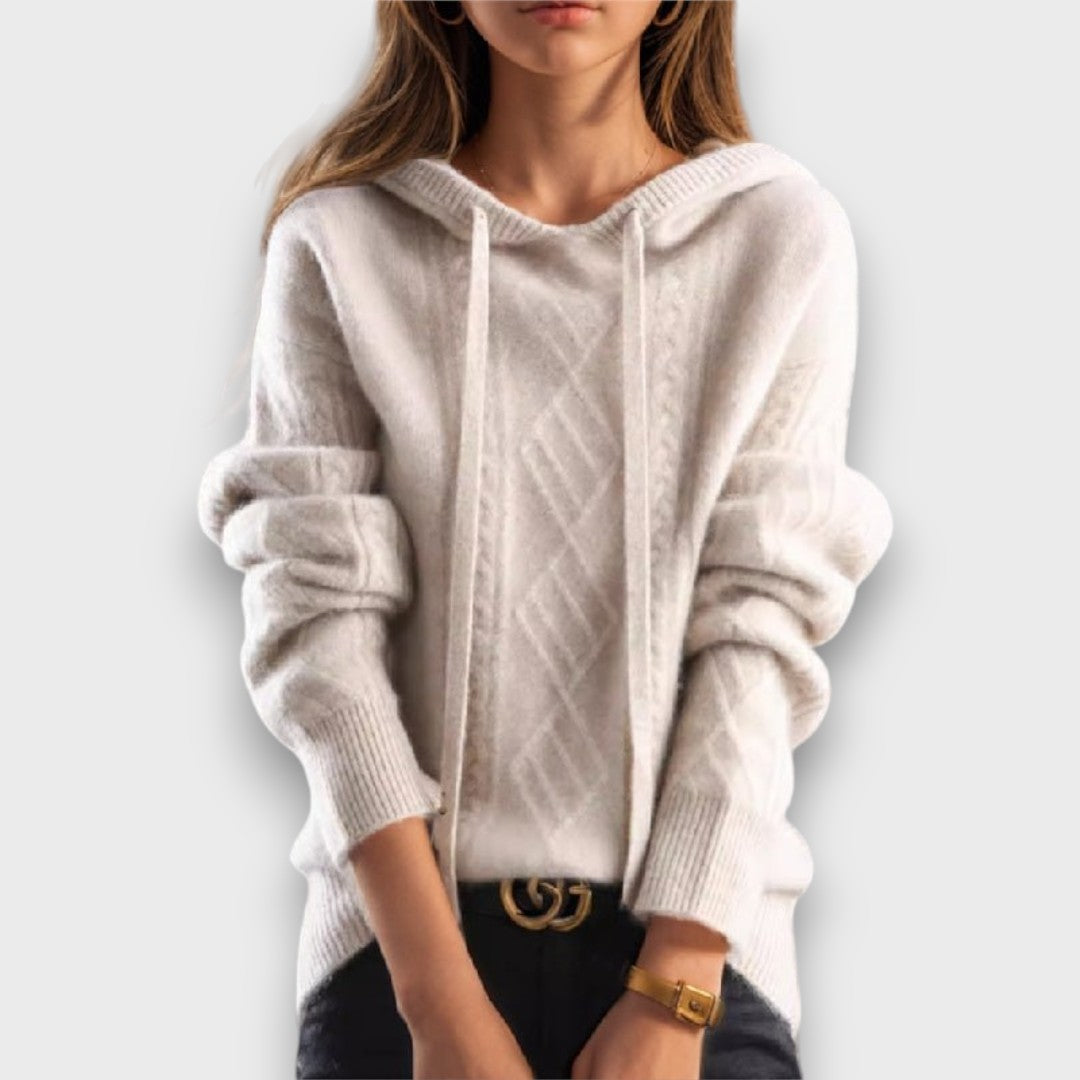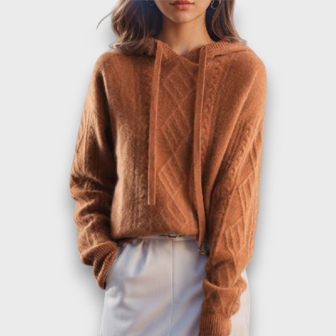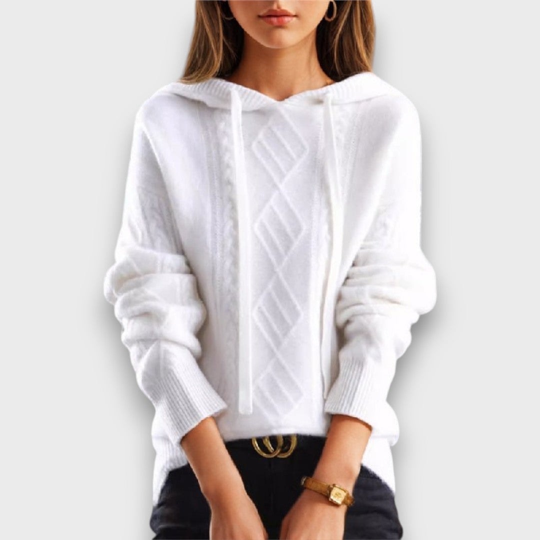 Valenne vereint gemütliche Wärme mit stilvoller Raffinesse. Das feine Zopfmuster verleiht dem Pullover Struktur und Eleganz, während die Kapuze einen lässigen Akzent setzt. Ein Pullover, der Geborgenheit schenkt und dennoch modisch modern wirkt.