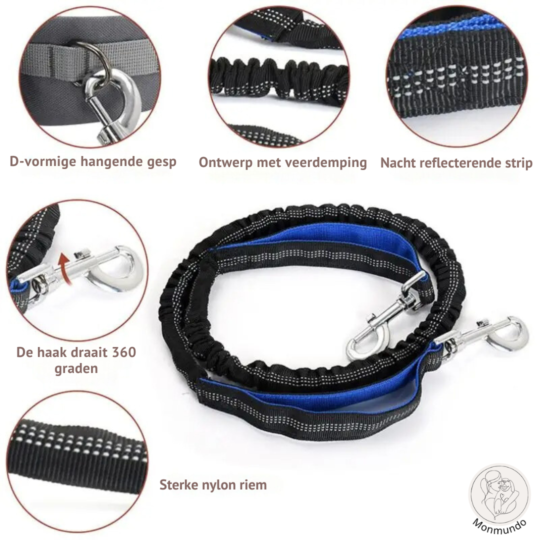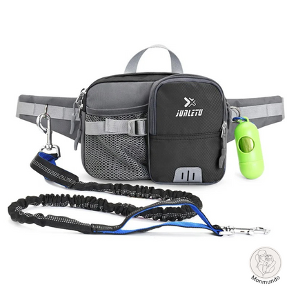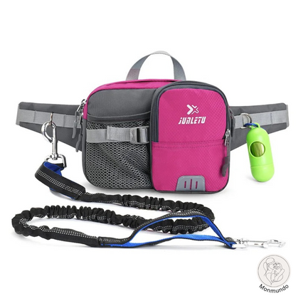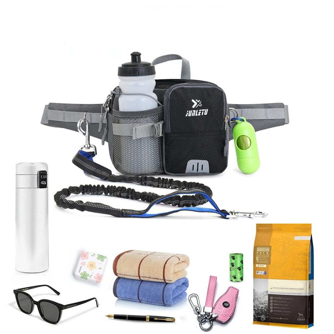 Die integrierte Hüfttasche verfügt über spezielle Fächer für Ihre wichtigsten Utensilien, darunter eine Handytasche und ein Trinkflaschenhalter. Außerdem bieten der gepolsterte Neoprengriff und die robusten D-Ringe mehr Komfort und Kontrolle. Es ist nicht nur eine Leine - es ist eine durchdachte Lösung für stressfreie Ausflüge.