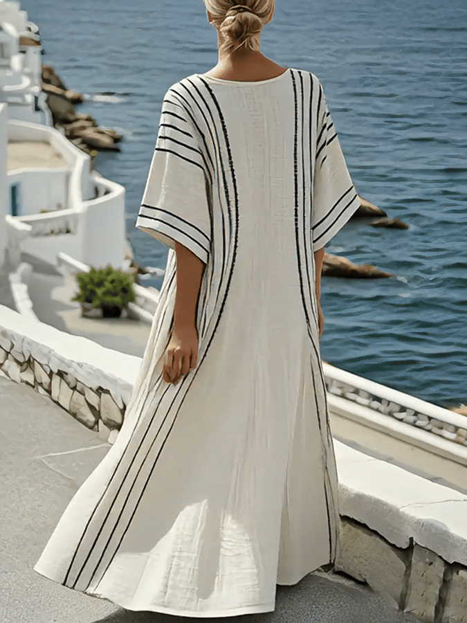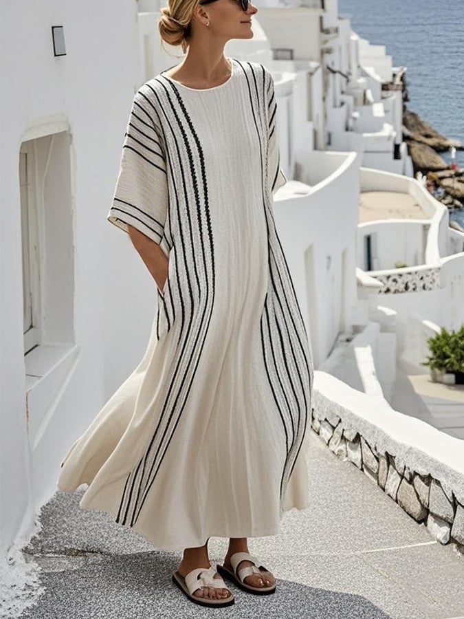 De Zaya jurk brengt contrast tot leven met haar uitgesproken strepen en relaxte pasvorm. Gemaakt van een lichte, ademende stof voor ultiem draagcomfort—perfect voor dagen waarop je effortless chic wilt uitstralen.